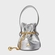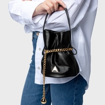 Bolsa bucket em couro com formato saco e acabamento macio. Fechamento por ajuste em corrente metálica com ponteira decorativa, alça curta para uso à mão ou no ombro e detalhe do ícone frontal.