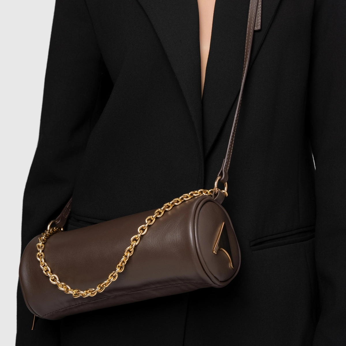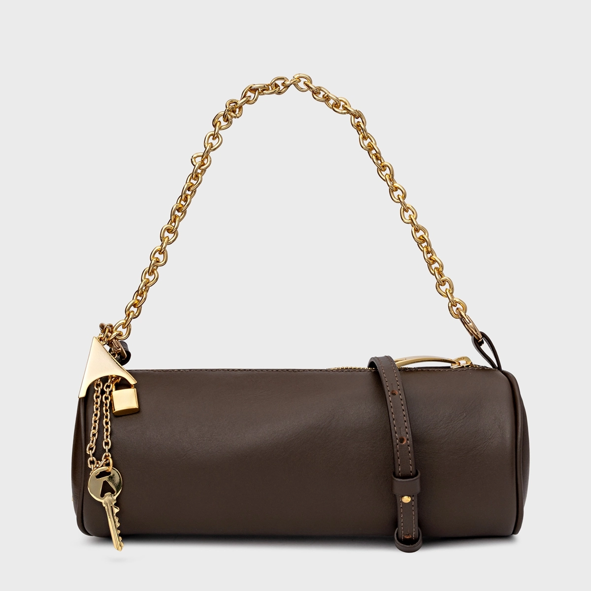 Bolsa cilindro em couro, com formato arredondado e acabamento liso. Possui alça em corrente metálica, fechamento por zíper e detalhe do ícone Carrano na lateral, para uso no ombro ou à mão.