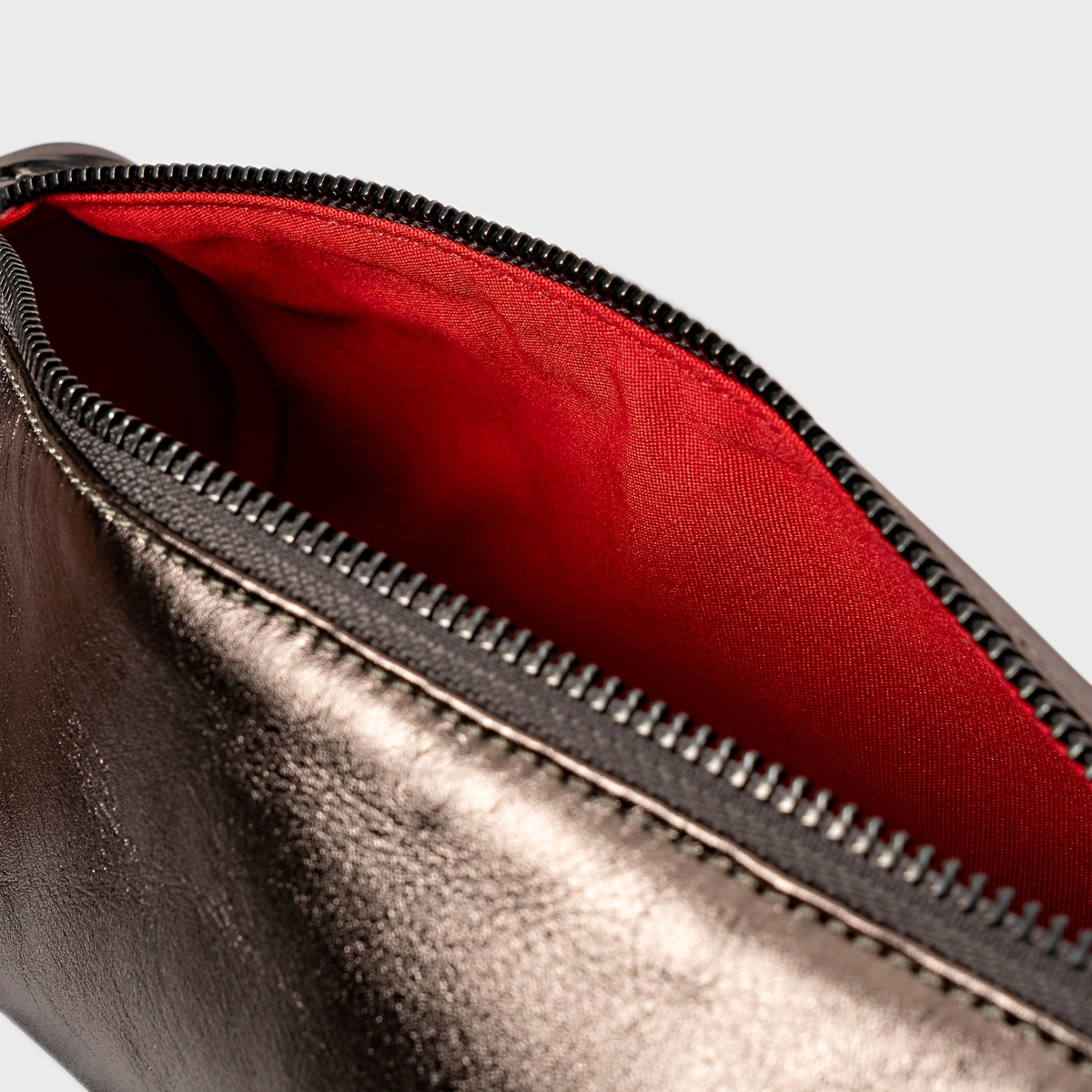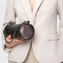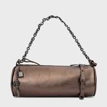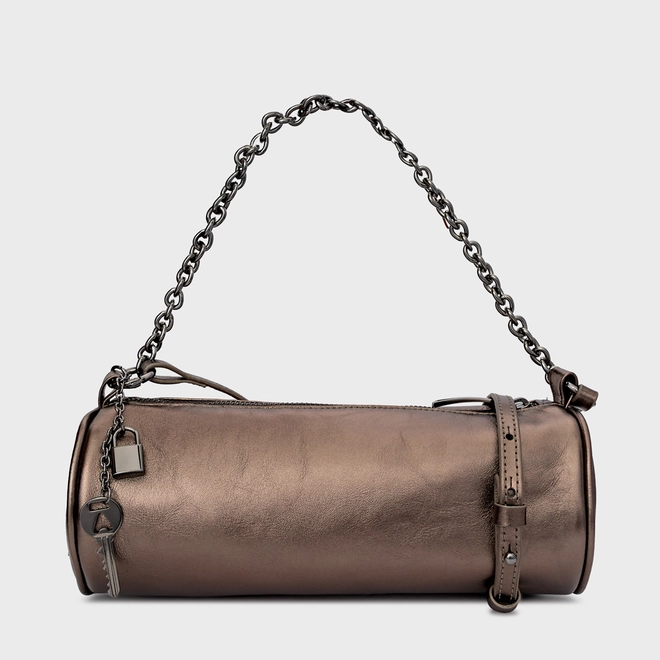 Bolsa cilindro em couro metalizado, formato arredondado e acabamento liso. Possui alça em corrente metálica, fechamento por zíper e detalhe do ícone Carrano na lateral, para uso no ombro ou à mão.