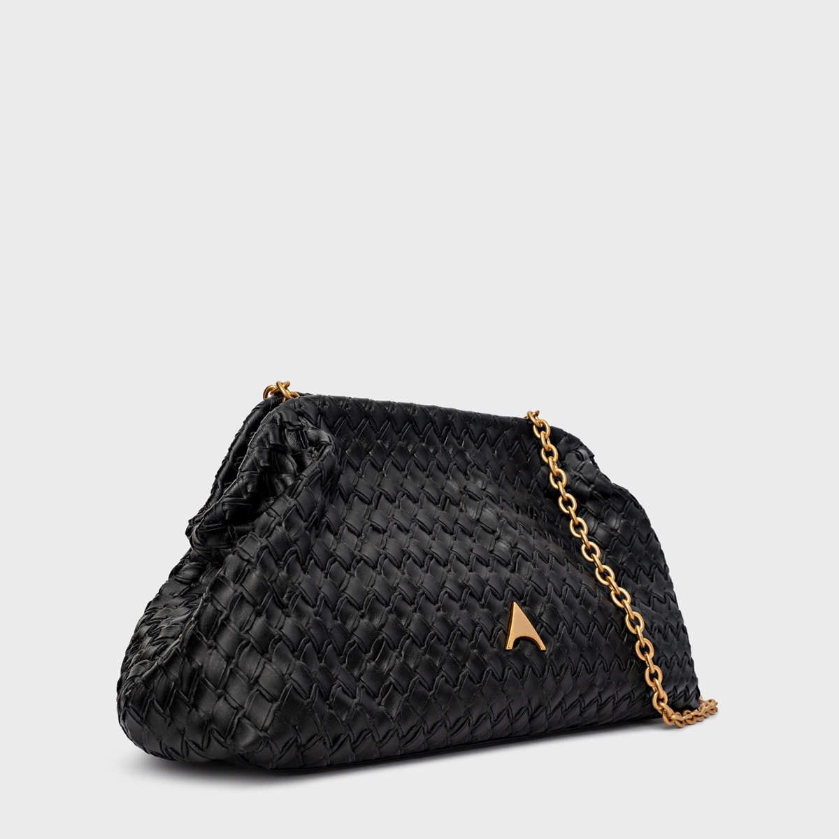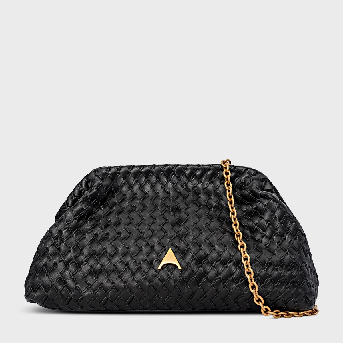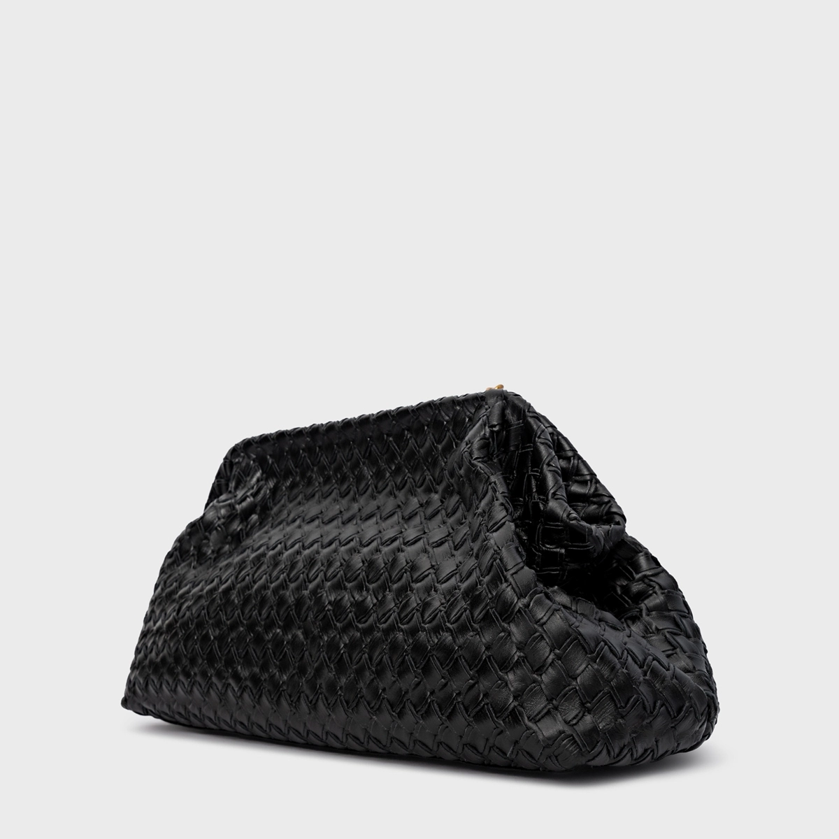 Bolsa clutch em couro e acabamento tramado. Possui fechamento superior com imã, alça em corrente metálica e detalhe do ícone Carrano frontal.