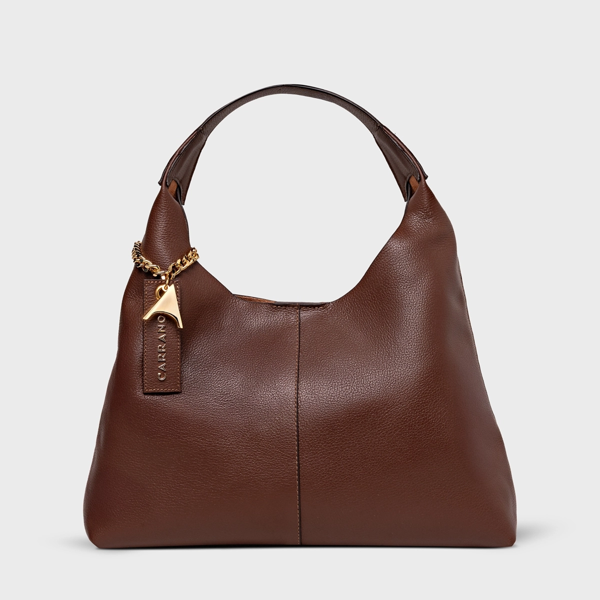 Bolsa hobo grande em couro com fechamento em ímã e aplicação de corrente que envolve a alça com o pingente do ícone em metal dourado, além da tag com a inscrição da marca.