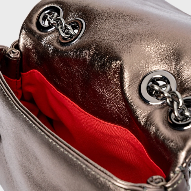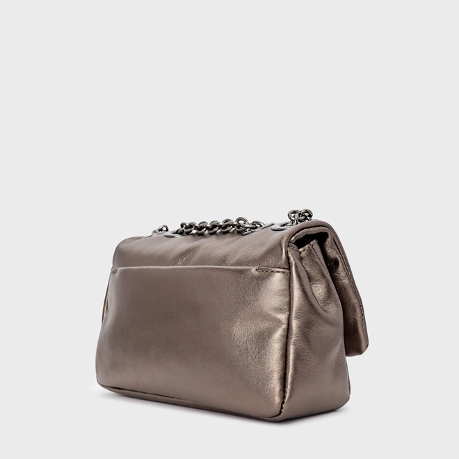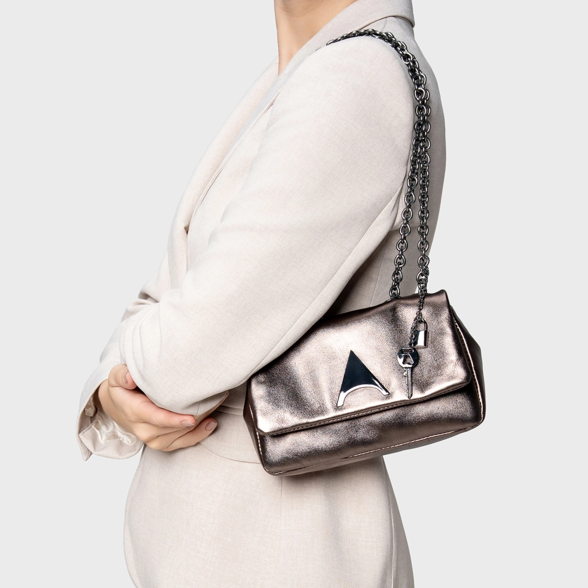 Bolsa tiracolo em couro com formato retangular e acabamento metalizado. Fechamento por aba com detalhe do ícone Carrano frontal, alça em corrente metálica e chaveiro aplicado na lateral.