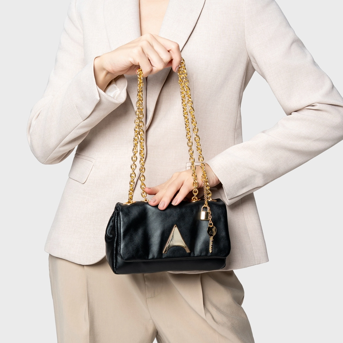 Por que apostar? Essa bolsa é a definição de item-chave para quem busca modernidade com um toque rebelde e sofisticado. O grande diferencial está nos detalhes: além do couro macio, ela apresenta bag charms exclusivos em formato de cadeado e chave, além de uma robusta alça de corrente que adiciona atitude ao design. Como usar? Misture a bolsa com uma calça de moletom cinza oversized, um blazer de ombros estruturados e boné. O contraste entre o esportivo e o fashionista é super atual.