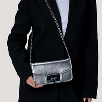 Bolsa tiracolo pequena em couro com shape retangular, fechamento em ímã no formato do ícone da marca e alça em corrente, que permite uso transversal ou no ombro.