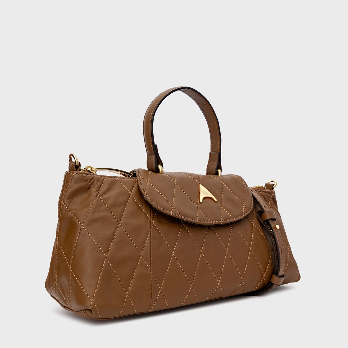Bolsa tiracolo em couro com acabamento matelassê e formato estruturado. Possui alça de mão, alça longa removível com regulagem e fechamento por aba com detalhe do ícone Carrano frontal.