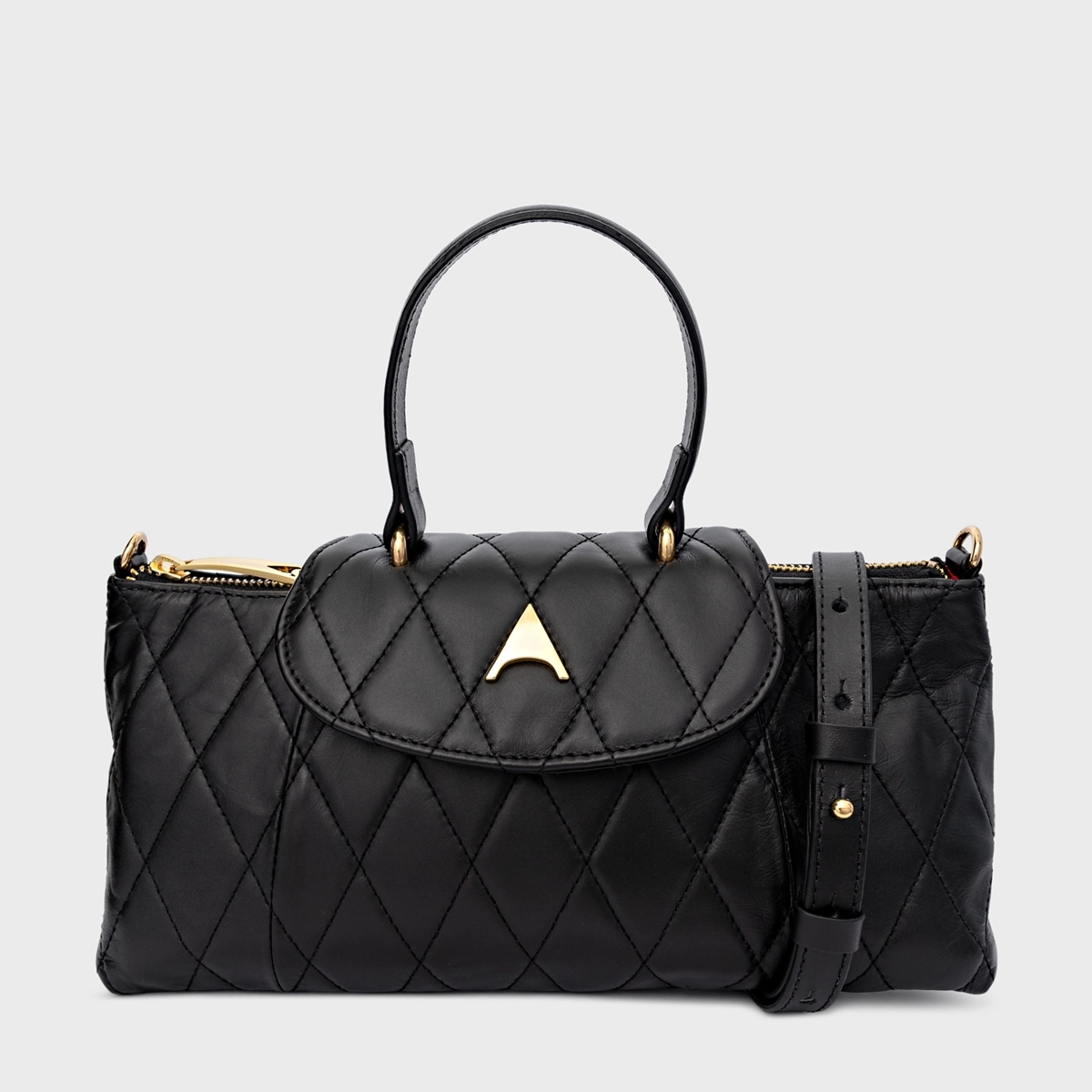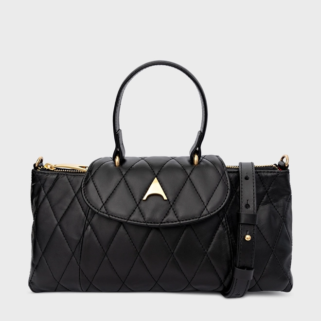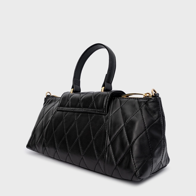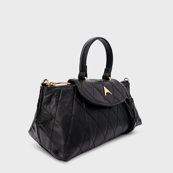 Bolsa tiracolo em couro com acabamento matelassê e formato estruturado. Possui alça de mão, alça longa removível com regulagem e fechamento por aba com detalhe do ícone Carrano frontal.
