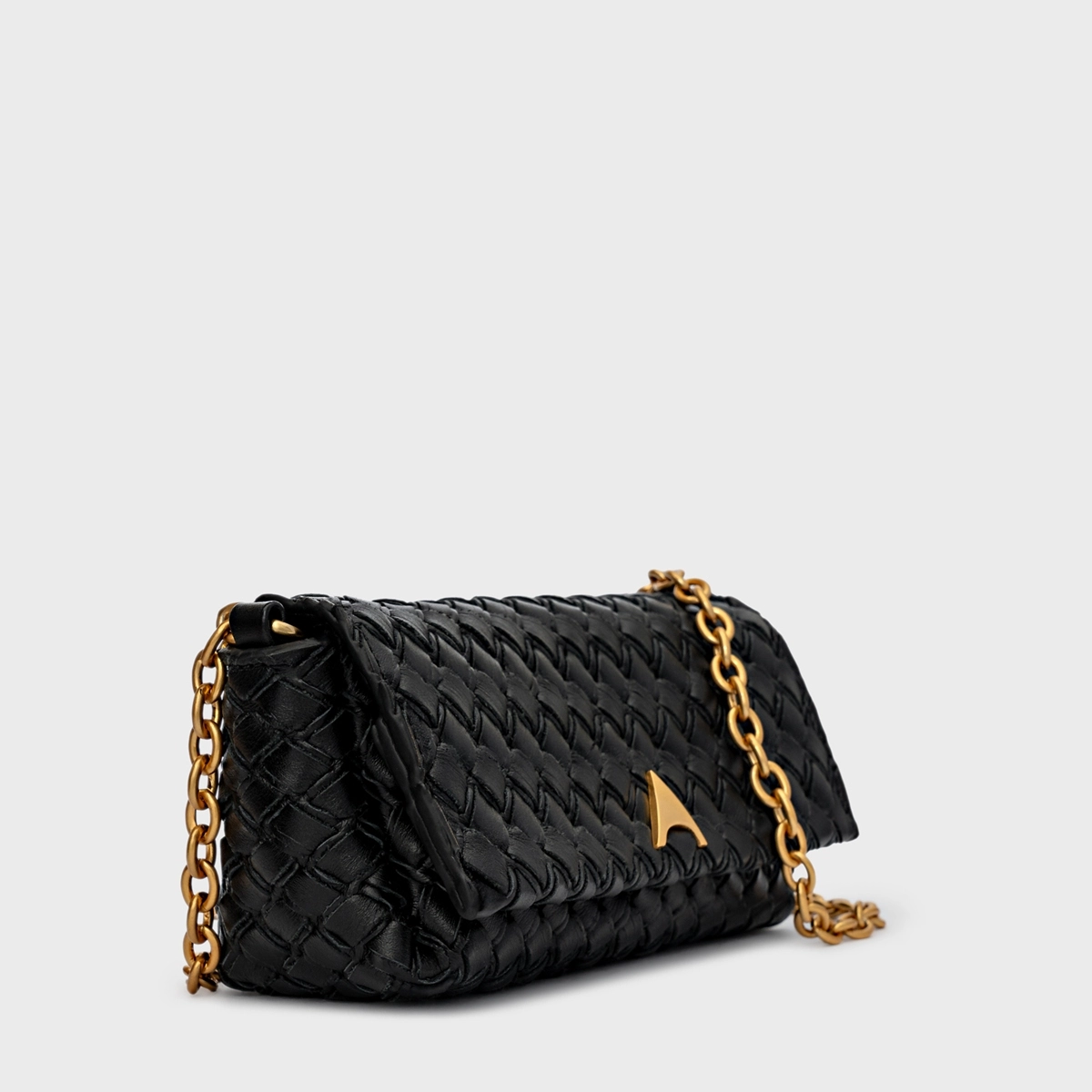 Bolsa tiracolo em couro com formato retangular e acabamento tramado. Possui alça longa em corrente metálica, fechamento superior e detalhe do ícone Carrano frontal, para uso transversal ou no ombro.