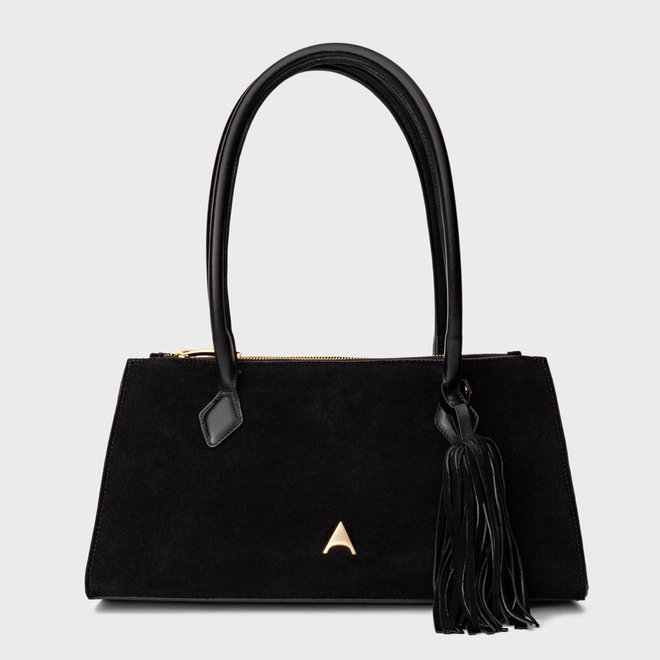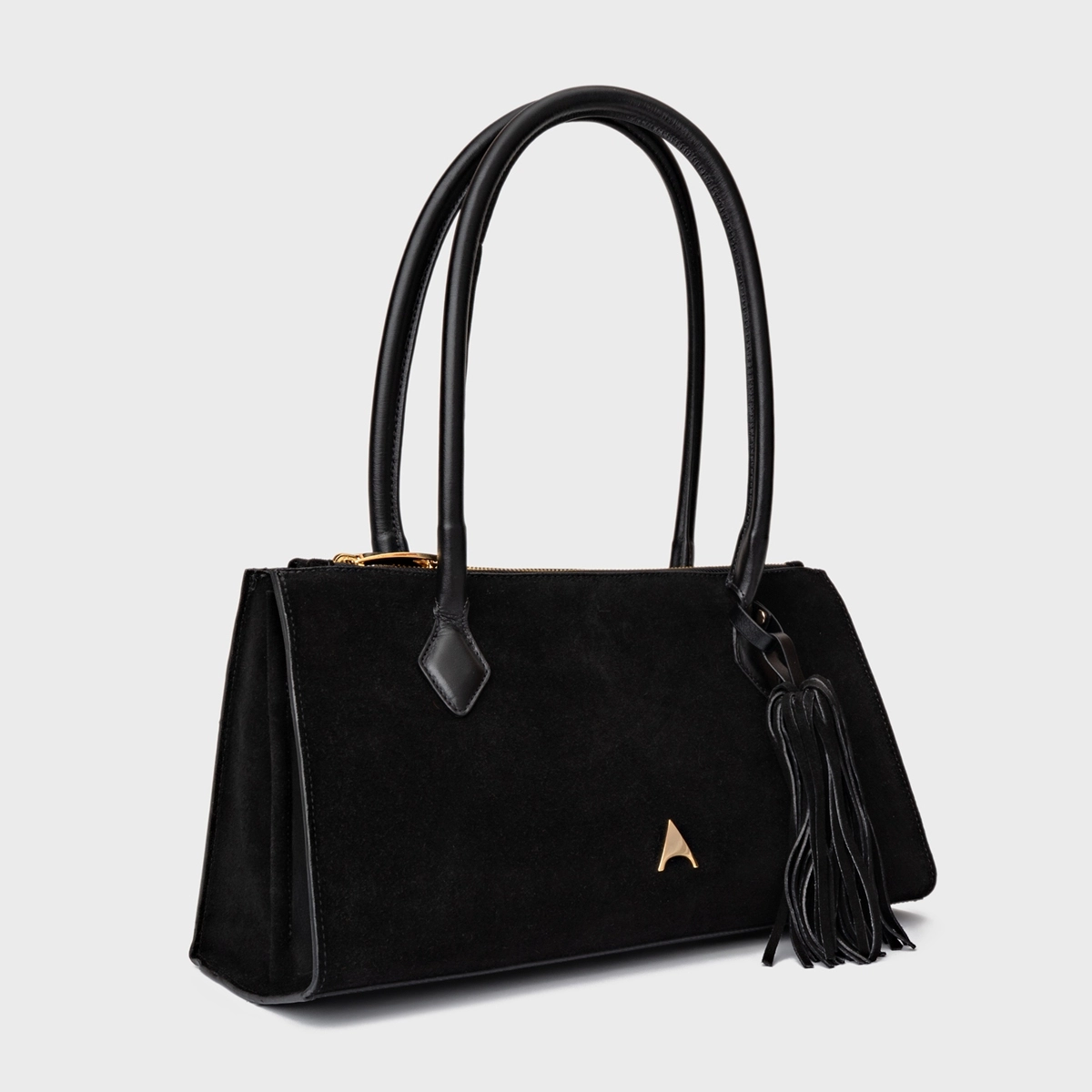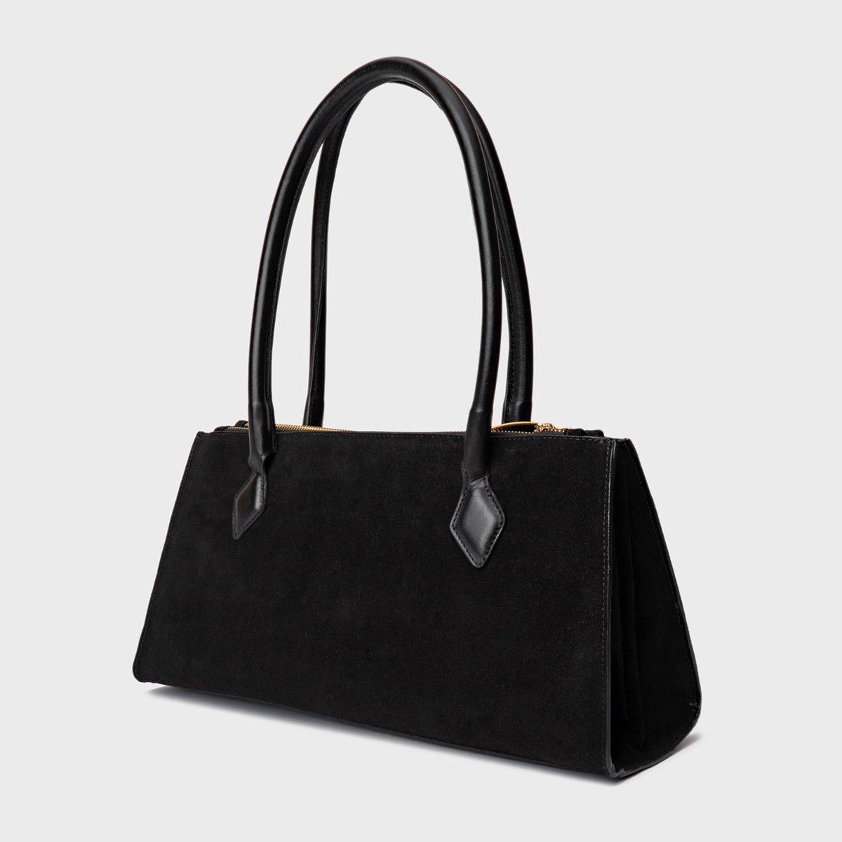 Bolsa tote em couro suede. Possui alças longas para uso no ombro, fechamento superior por zíper, detalhe do ícone Carrano e barbicacho aplicado na lateral.