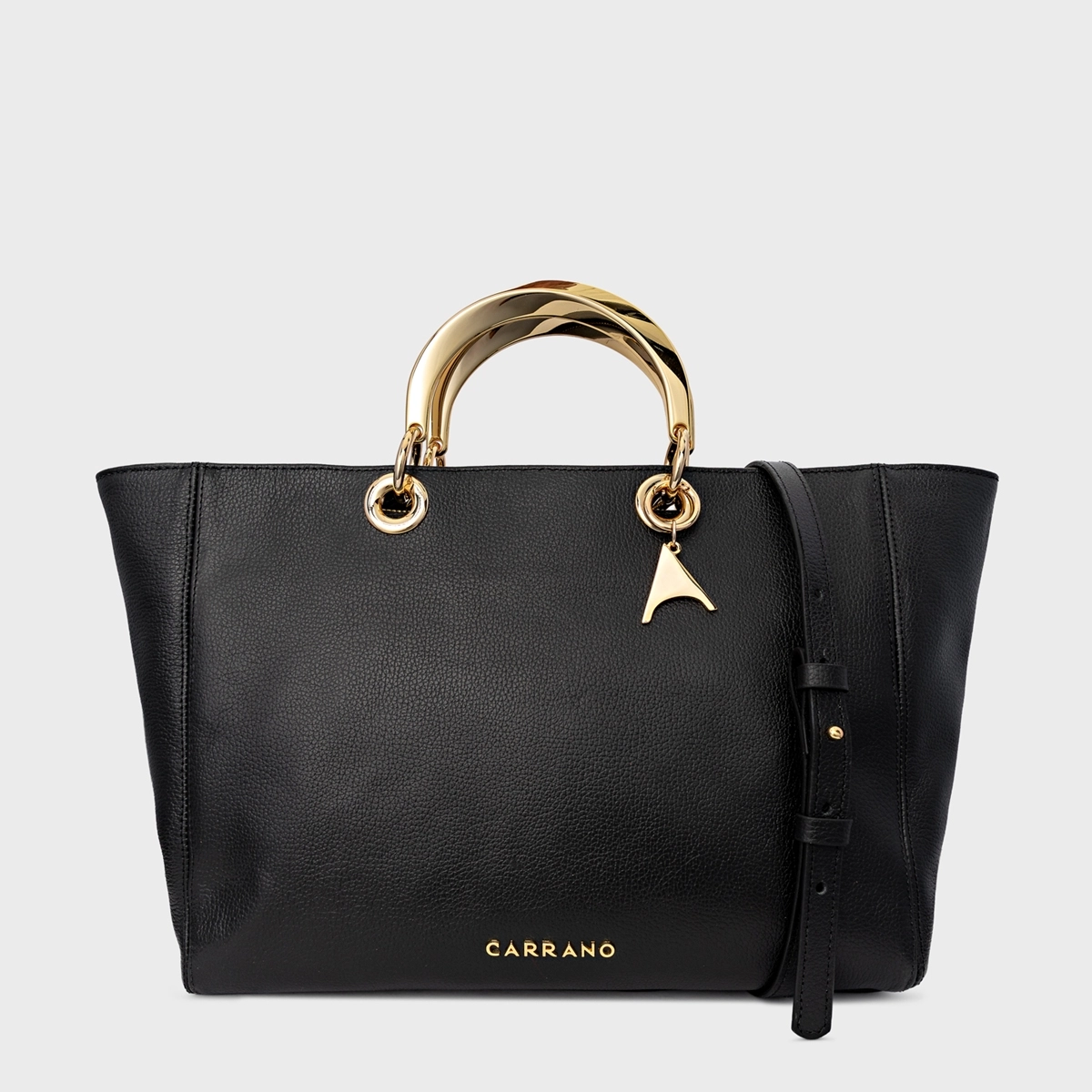 Bolsa tote em couro, com formato estruturado e acabamento liso. Possui alças de mão rígidas metálicas, alça para uso transversal e detalhe em corrente com pingente aplicado.