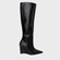 Por que apostar? A bota de cano alto com salto anabela une impacto visual e conforto. É uma peça marcante, com design forte, que atravessa temporadas como item de estilo e não apenas de tendência. Como usar? Traga um ar sexy ao combinar com saia acetinada de borda rendada e assimétrica, criando contraste entre fluidez e estrutura. Para equilibrar, aposte em uma jaqueta bomber de gola alta, que adiciona peso e atitude ao look, deixando a bota como protagonista da produção.