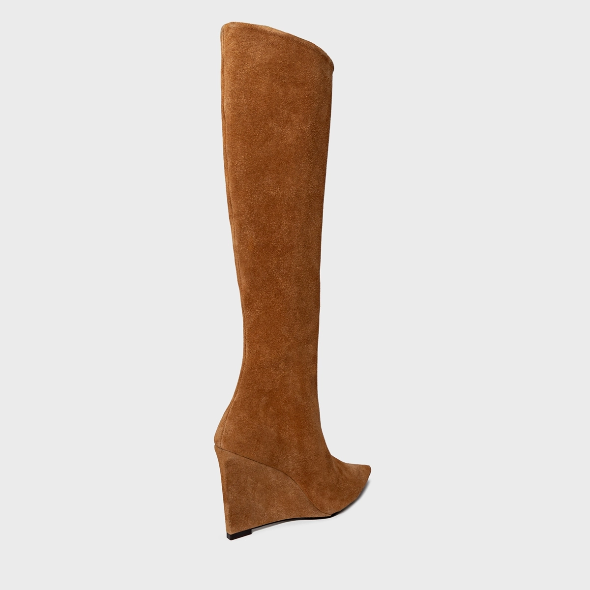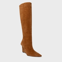 Bota de cano alto slouchy em couro suede. Possui salto anabela, bico fino e zíper lateral para facilitar o calce.