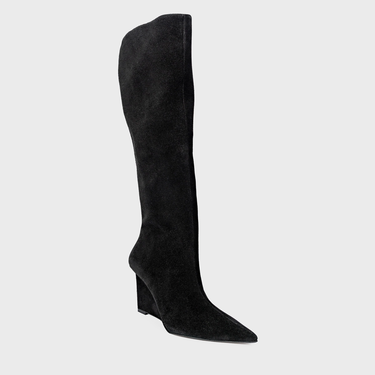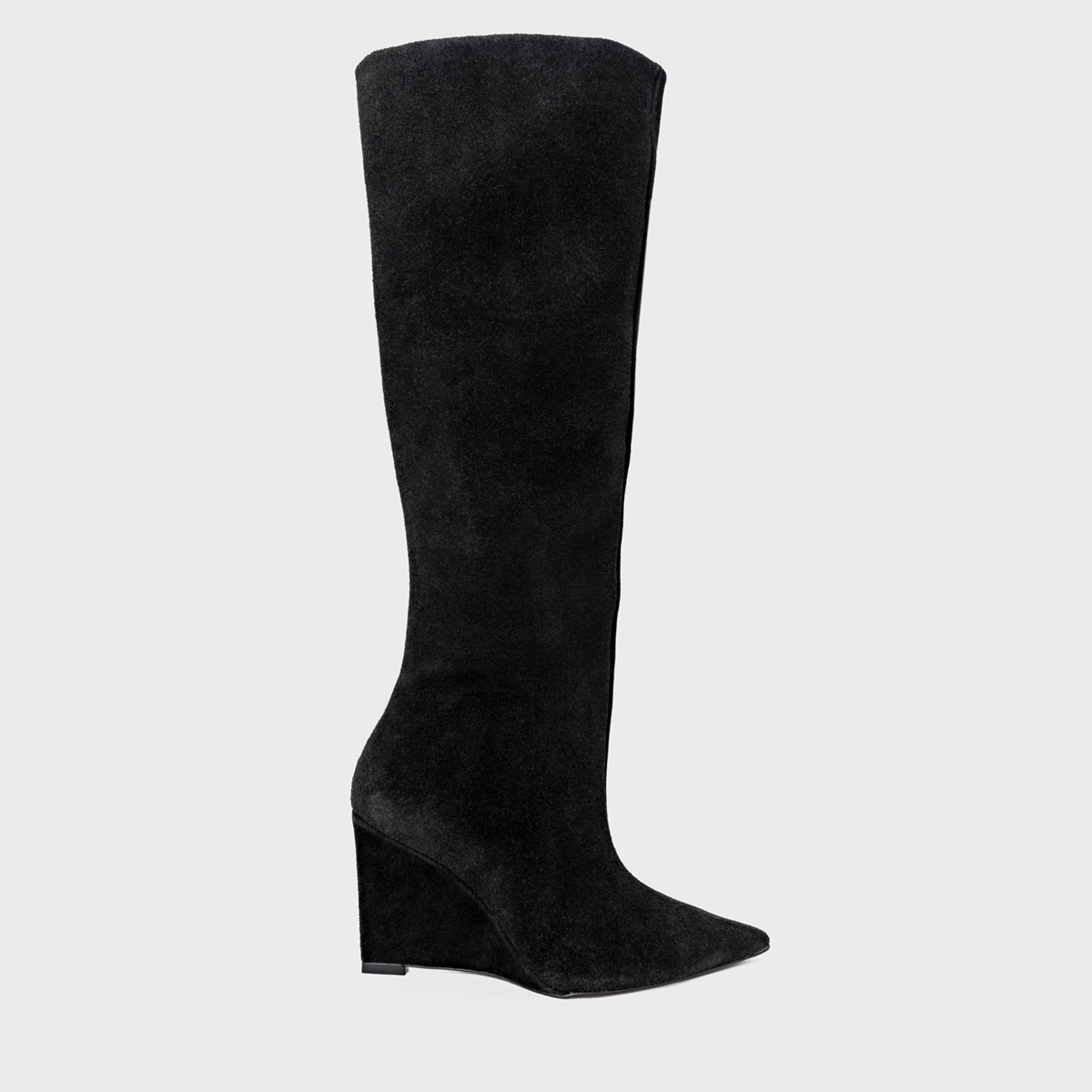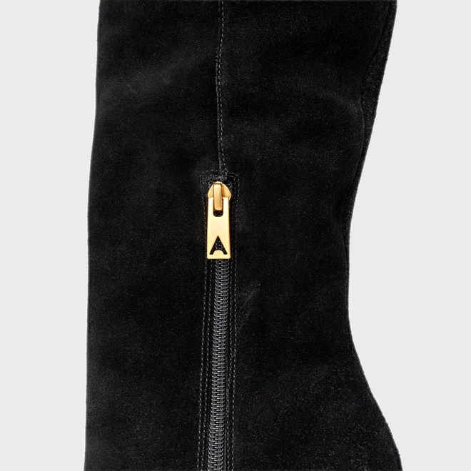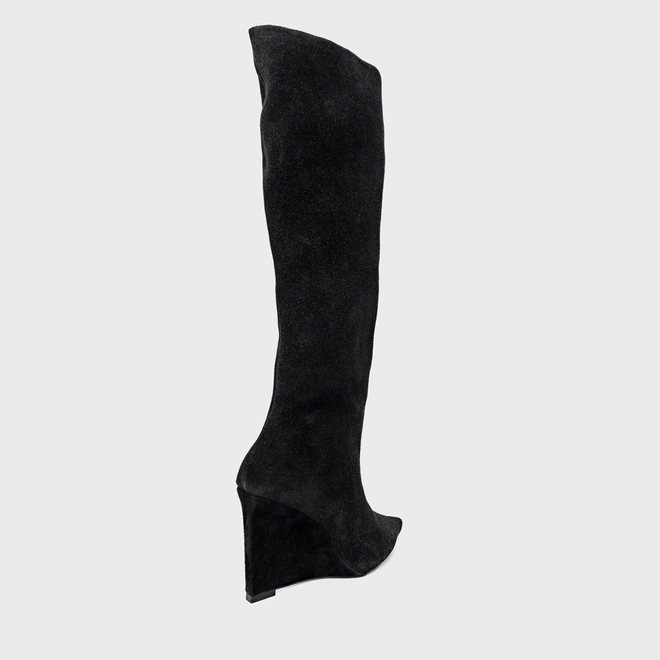 Bota de cano alto slouchy em couro suede. Possui salto anabela, bico fino e zíper lateral para facilitar o calce.