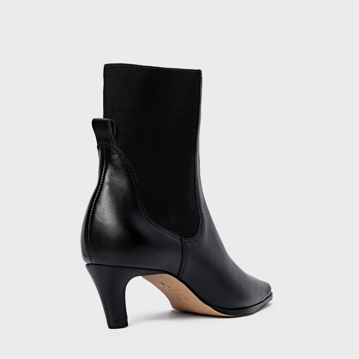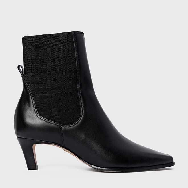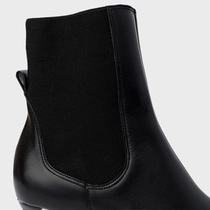 Bota em couro, com salto estilo kitten heel. Possui elástico na lateral para facilitar o calce, além de puxador na parte traseira.