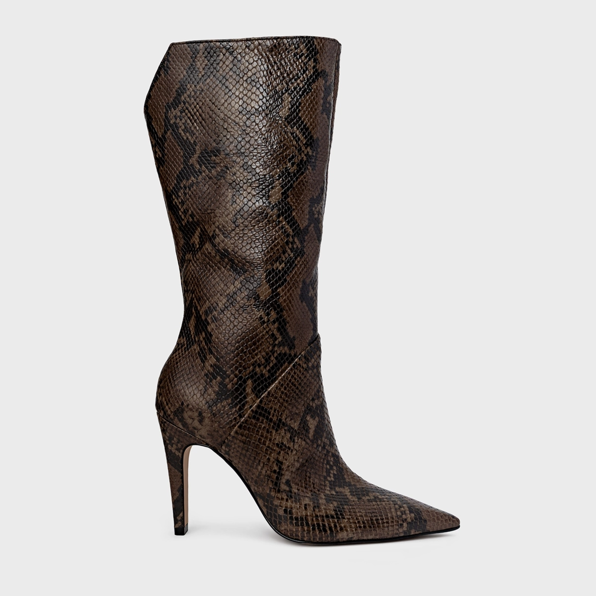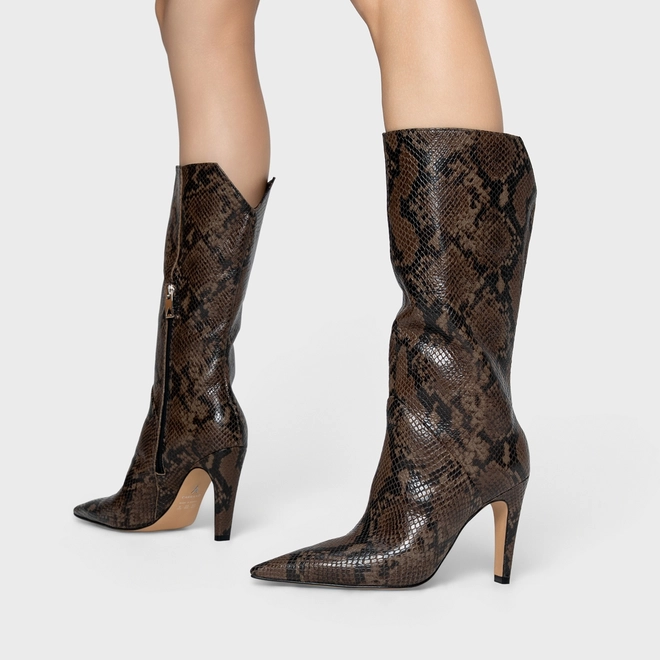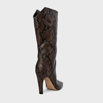 Bota de cano alto em couro snake. Possui salto fino, recorte em V na parte traseira e zíper lateral para facilitar o calce.