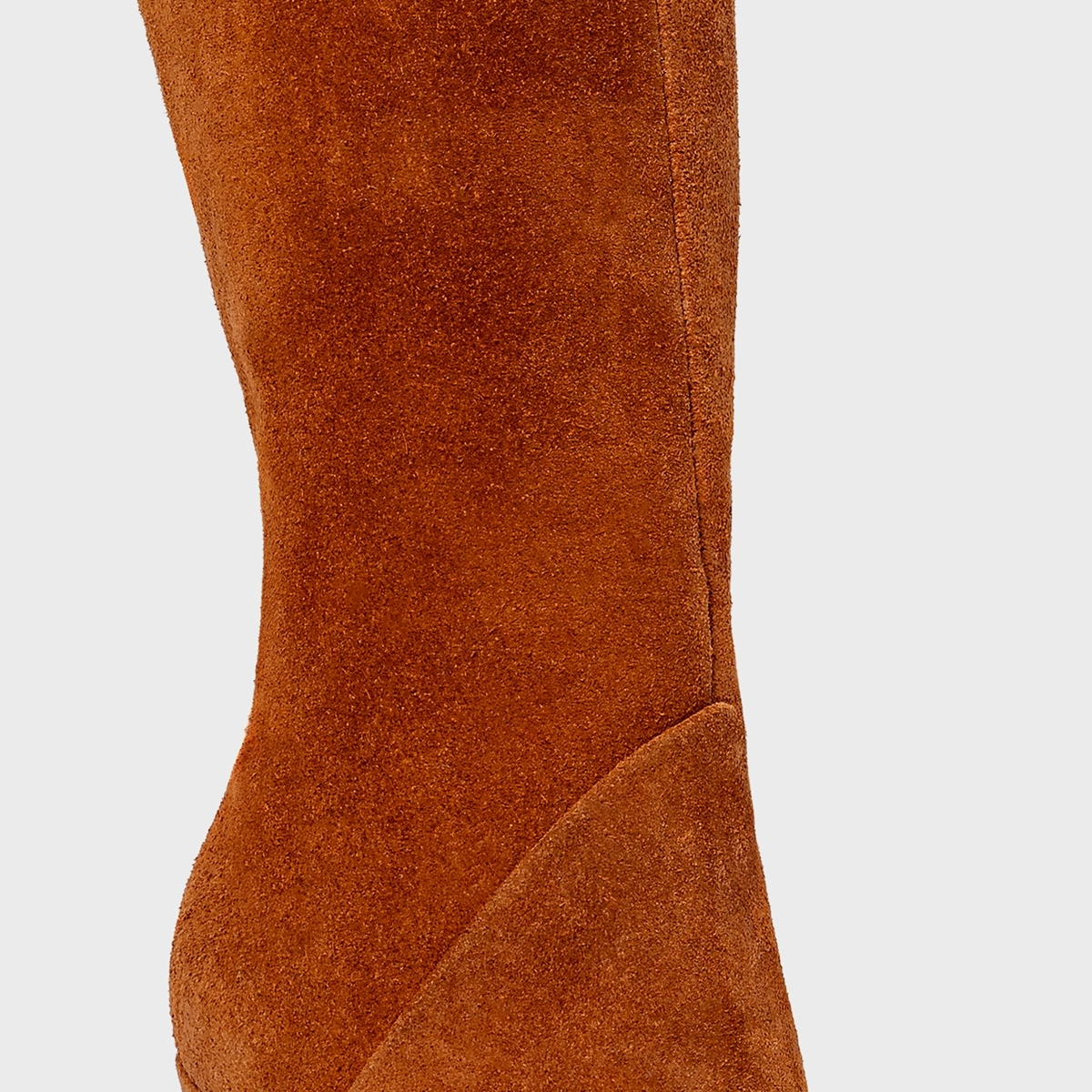 Bota de cano alto em couro suede. Possui salto fino, recorte em V na parte traseira e zíper lateral para facilitar o calce.