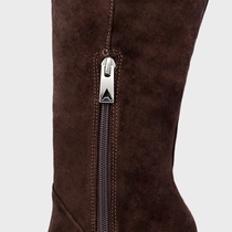 Bota de cano alto em couro suede. Possui salto fino, recorte em V na parte traseira e zíper lateral para facilitar o calce.