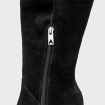 Bota de cano alto em couro suede. Possui salto fino, recorte em V na parte traseira e zíper lateral para facilitar o calce.