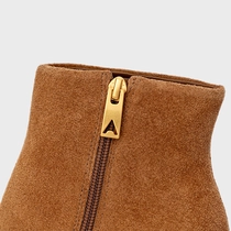 Bota cano baixo em couro suede, com bico fino e salto oval. O modelo apresenta cabedal liso e fechamento por zíper lateral.