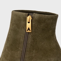 Bota cano baixo em couro suede, com bico fino e salto oval. O modelo apresenta cabedal liso e fechamento por zíper lateral.