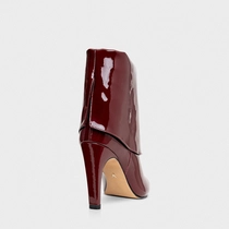 Bota em couro verniz com bico fino alongado, salto que possui uma largura mais robusta e sobreposição de couro, criando um efeito capa. Palmilha com ícone aplicado e inscrição do nome da marca.