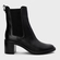 Bota em couro, com salto bloco e bico arredondado. Possui elástico na lateral para facilitar o calce, além de puxador na parte traseira.