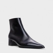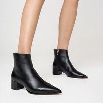 Bota cano baixo em couro, com bico fino e salto bloco. O modelo apresenta cabedal liso e fechamento por zíper lateral.