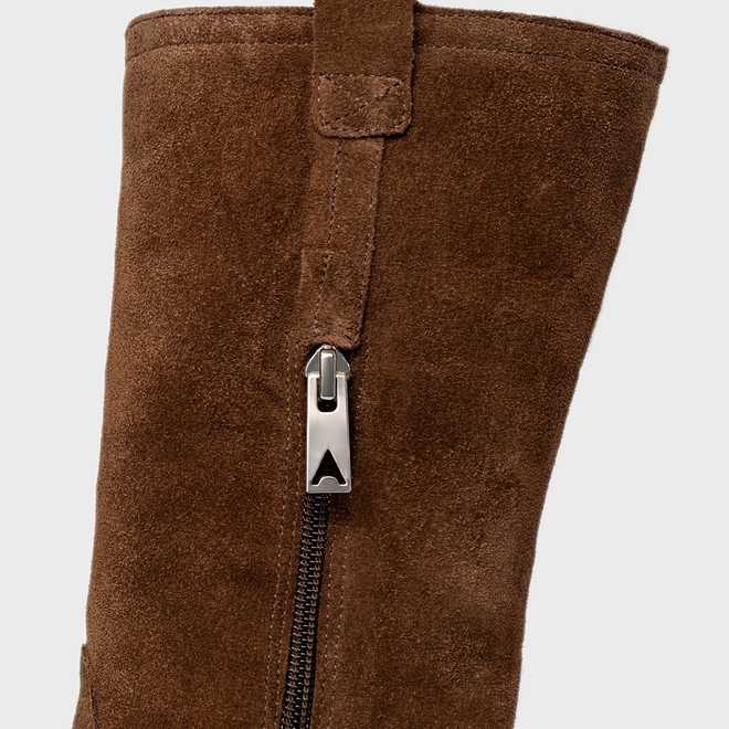 Bota de cano alto em couro suede. Possui solado tratorado robusto e elástico puxador na lateral para facilitar o calce.
