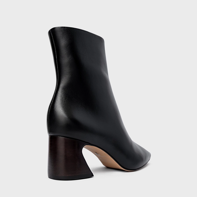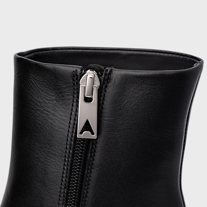 Bota cano médio em couro, com bico fino e salto geométrico. O modelo apresenta cabedal liso e fechamento por zíper lateral.