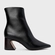 Bota cano médio em couro, com bico fino e salto geométrico. O modelo apresenta cabedal liso e fechamento por zíper lateral.
