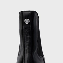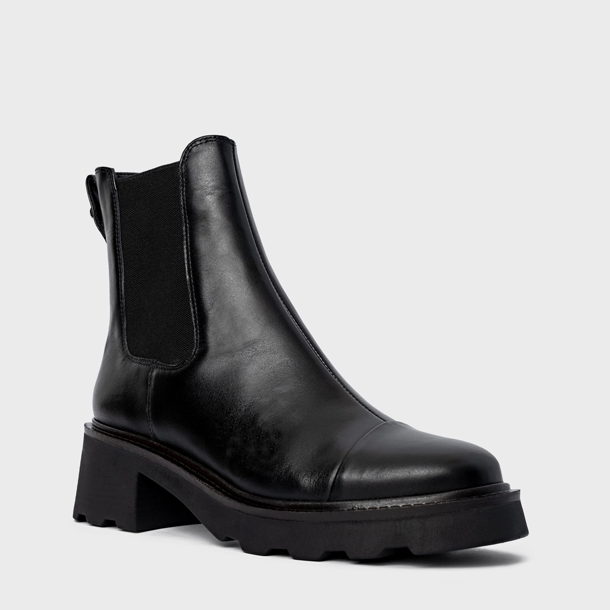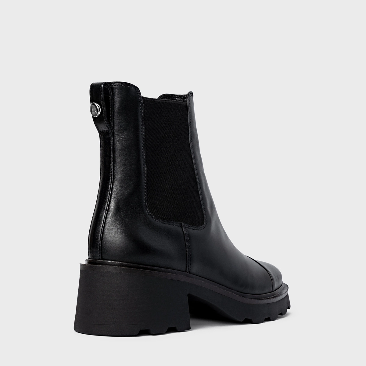 Bota coturno em couro, com salto robusto tratorado. Possui elástico na lateral para facilitar o calce, além de puxador na parte traseira.