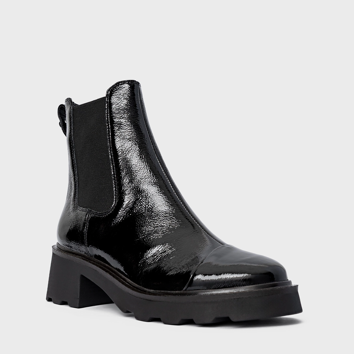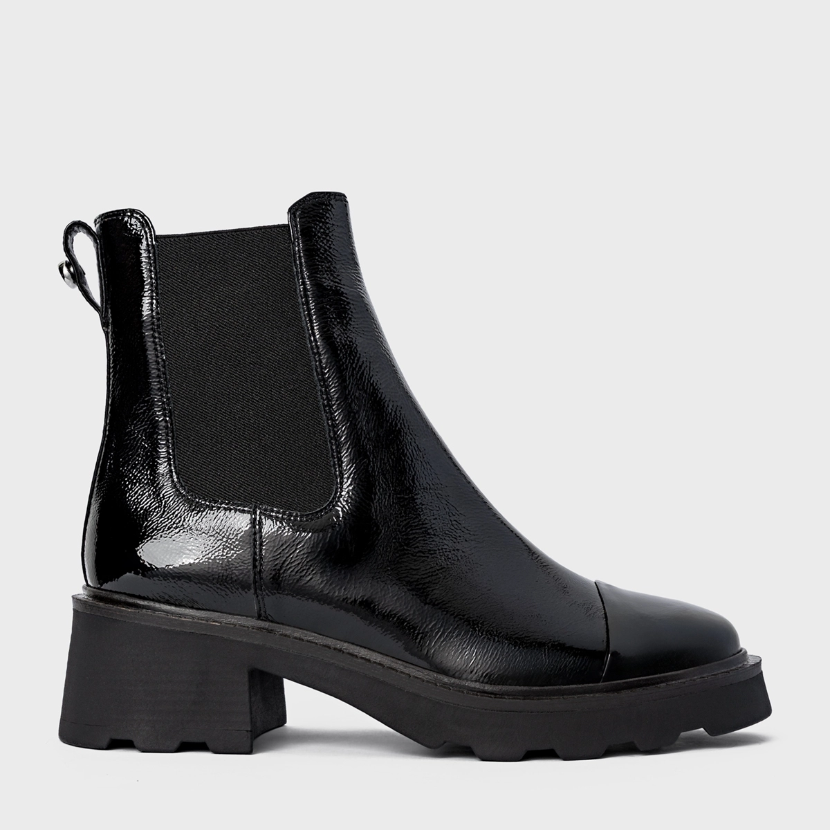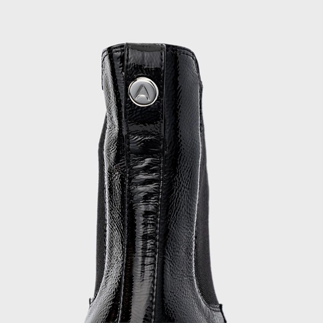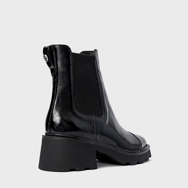 Bota coturno em couro verniz, com salto robusto tratorado. Possui elástico na lateral para facilitar o calce, além de puxador na parte traseira.