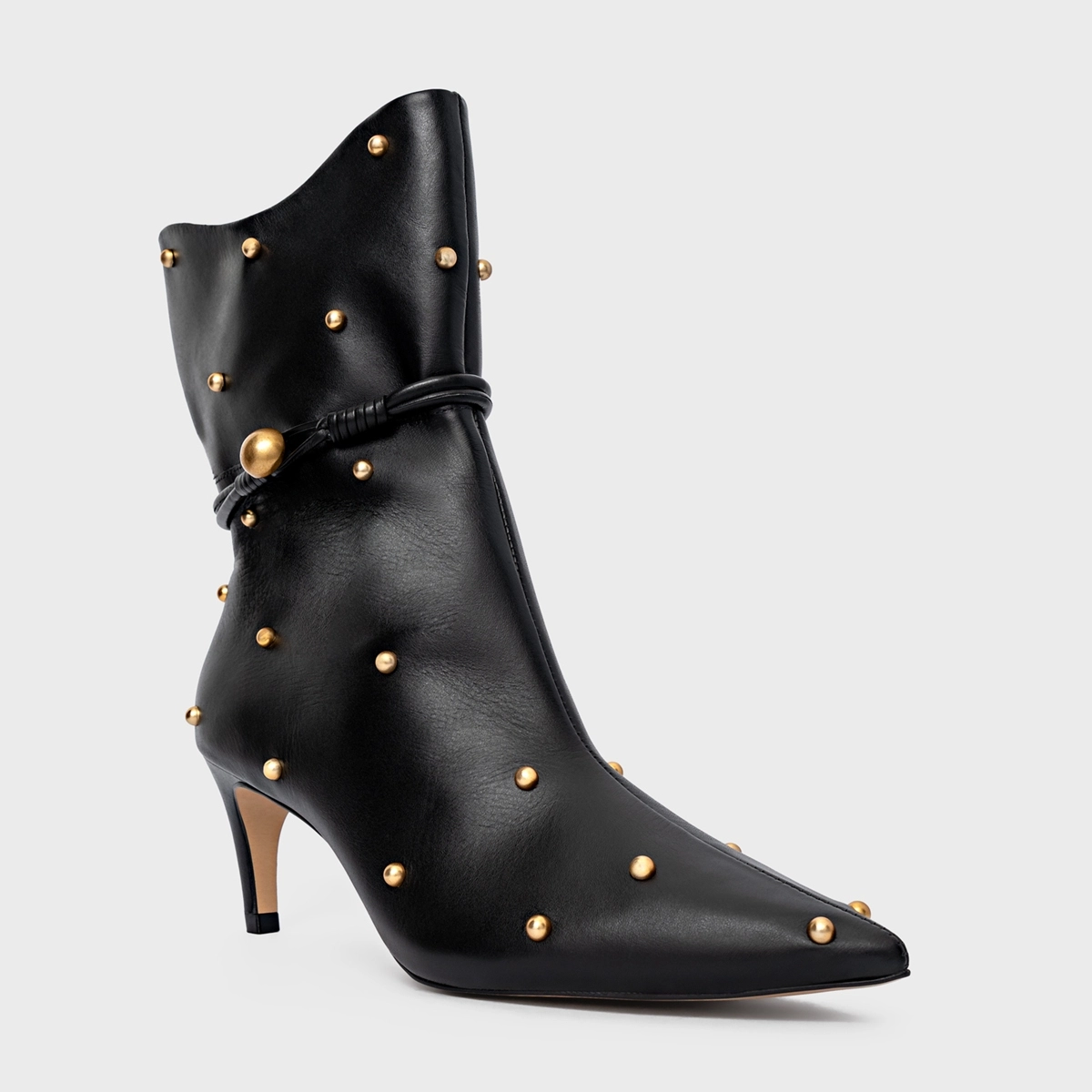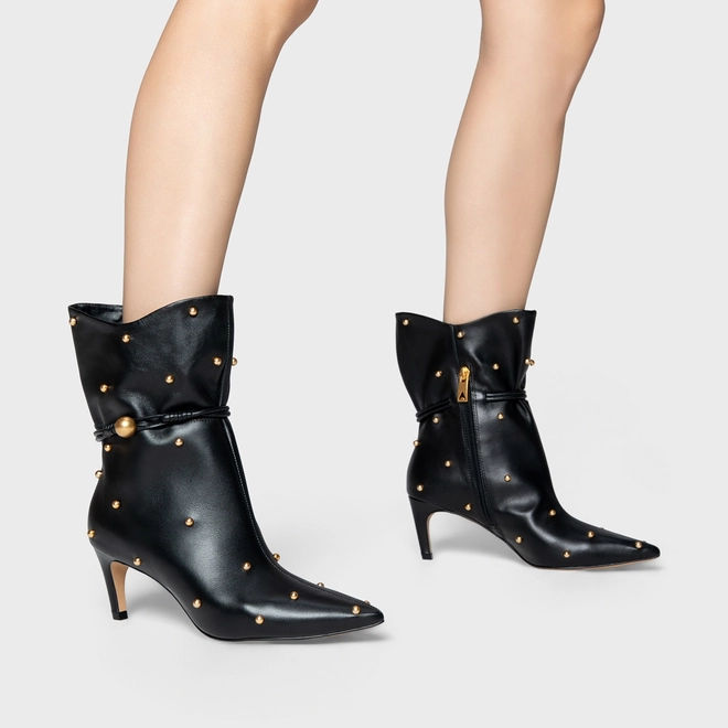 Bota de cano curto em couro. Com bico fino, adornada com enfeites dourados, com tira detalhada com esfera contornando todo o cano e fechamento lateral por zíper.