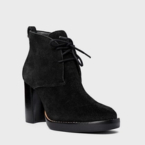 Bota em couro suede, com cano baixo e bico arredondado. Possui salto bloco alto, fechamento por amarração frontal e solado robusto.