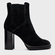 Bota em couro suede, com cano baixo e bico arredondado. Possui salto bloco alto, elástico lateral e solado robusto.