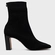 Bota em knit. O modelo tem cano médio, salto bloco e bico alongado. Traz cabedal ajustado ao pé, cano estilo meia e tira de gorgurão na parte traseira, auxiliando no calce.