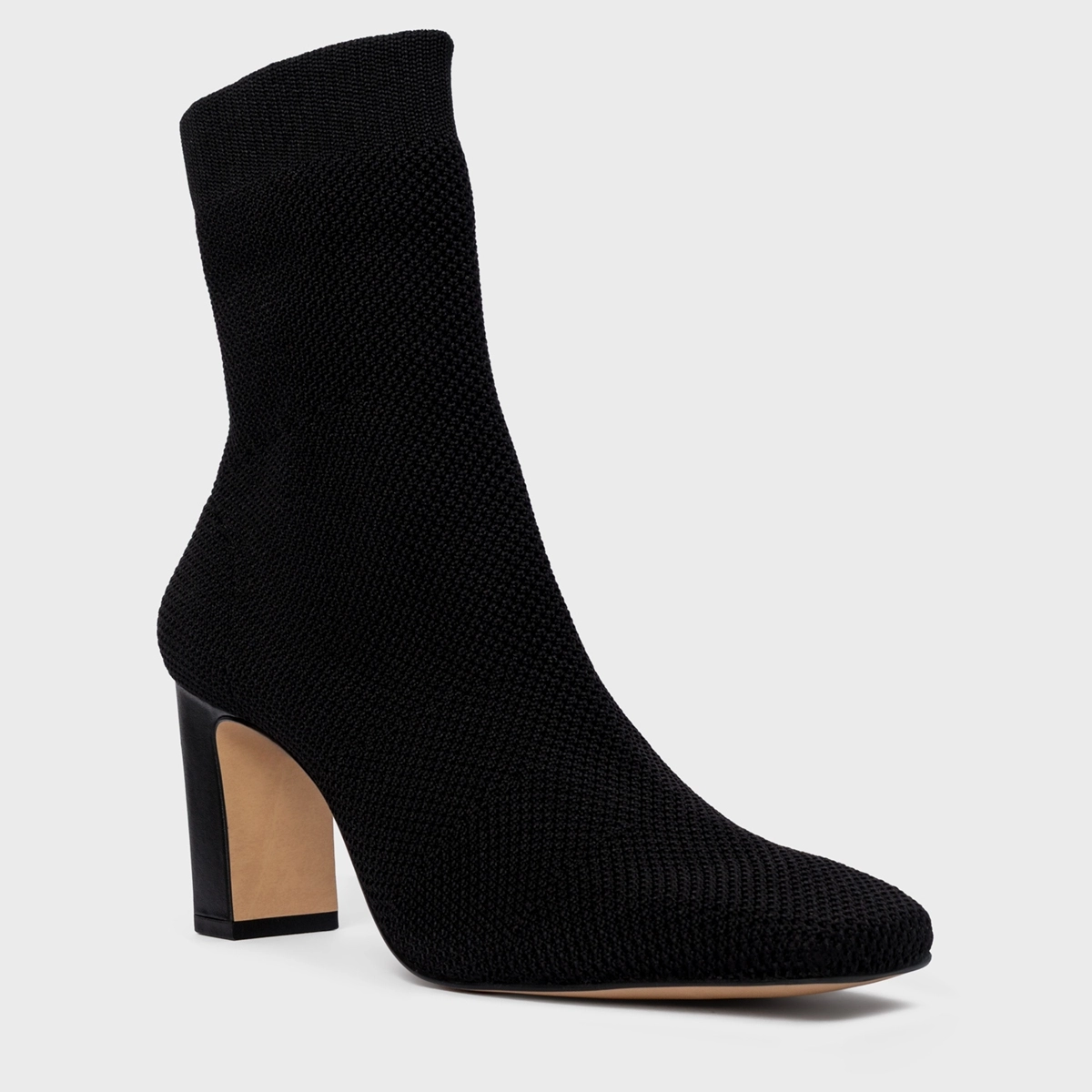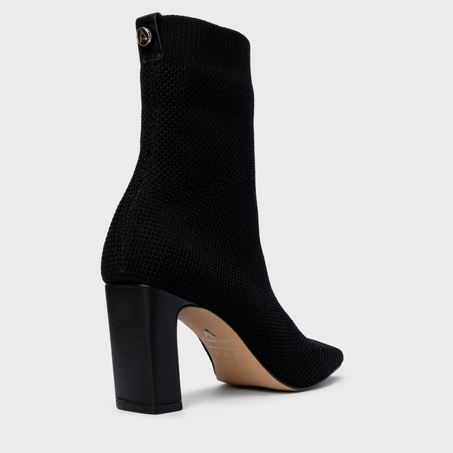 Bota em knit. O modelo tem cano médio, salto bloco e bico alongado. Traz cabedal ajustado ao pé, cano estilo meia e tira de gorgurão na parte traseira, auxiliando no calce.