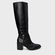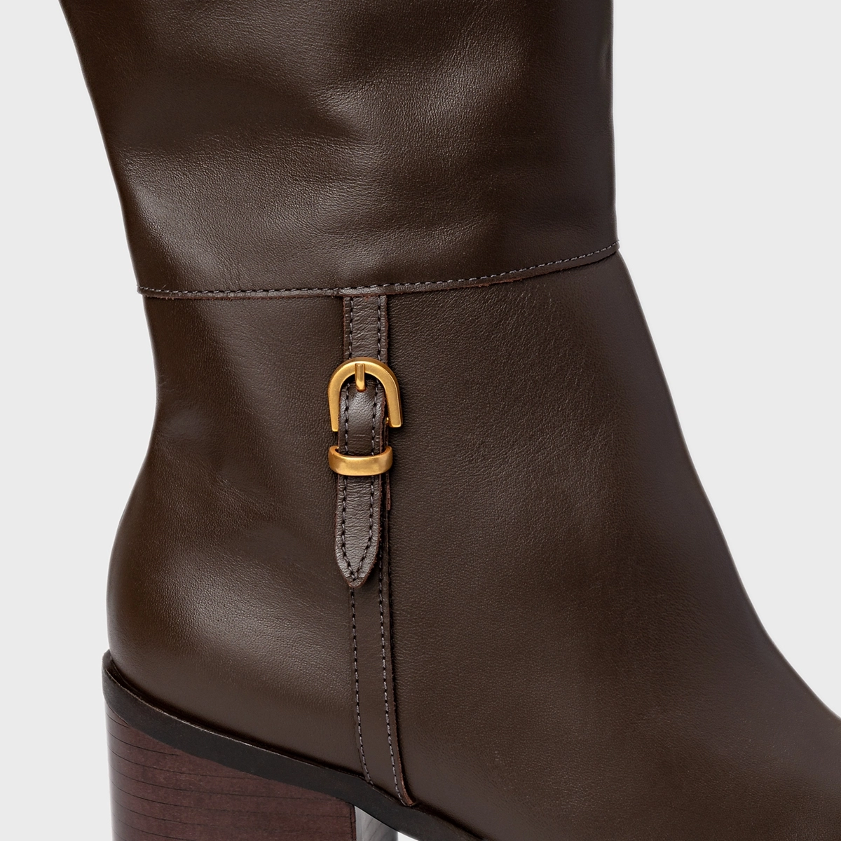 Bota de cano alto em couro. Possui salto bloco e zíper lateral para facilitar o calce, acompanhada de uma fivela delicada como detalhe no cano.