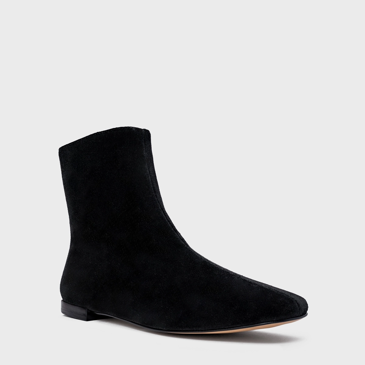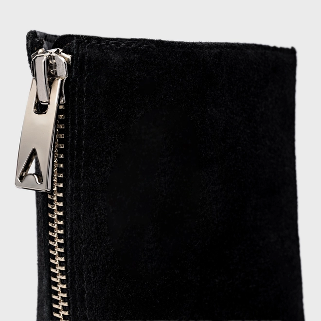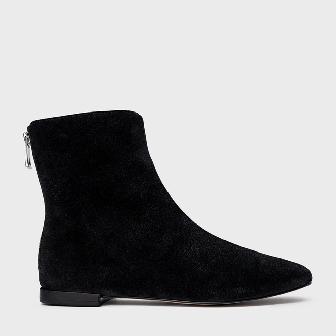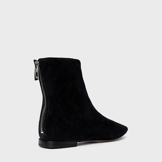 Bota em couro suede, de cano baixo. Possui bico alongado com ponteira quadrada e fechamento por zíper na parte traseira.