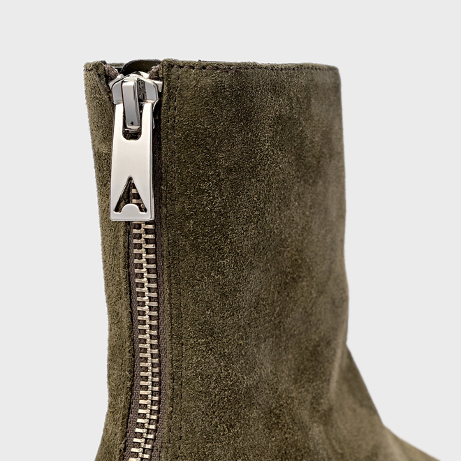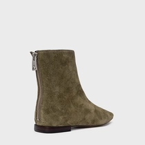 Bota em couro suede, de cano baixo. Possui bico alongado com ponteira quadrada e fechamento por zíper na parte traseira.