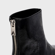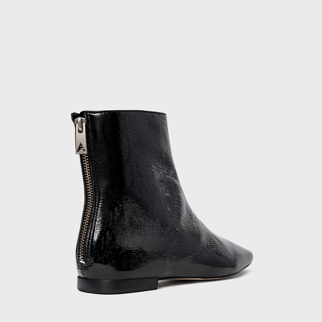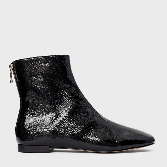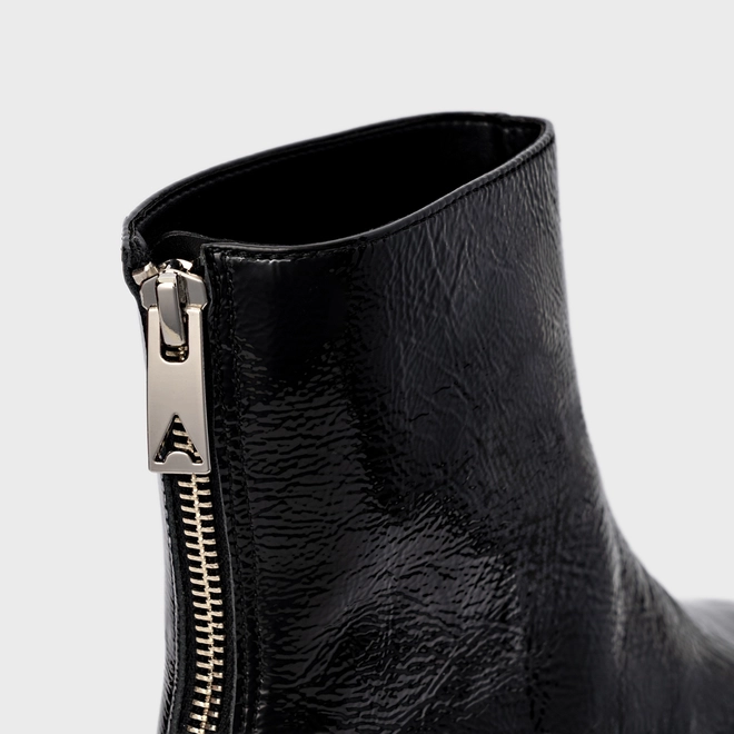 Bota em couro verniz, de cano baixo. Possui bico alongado com ponteira quadrada e fechamento por zíper na parte traseira.