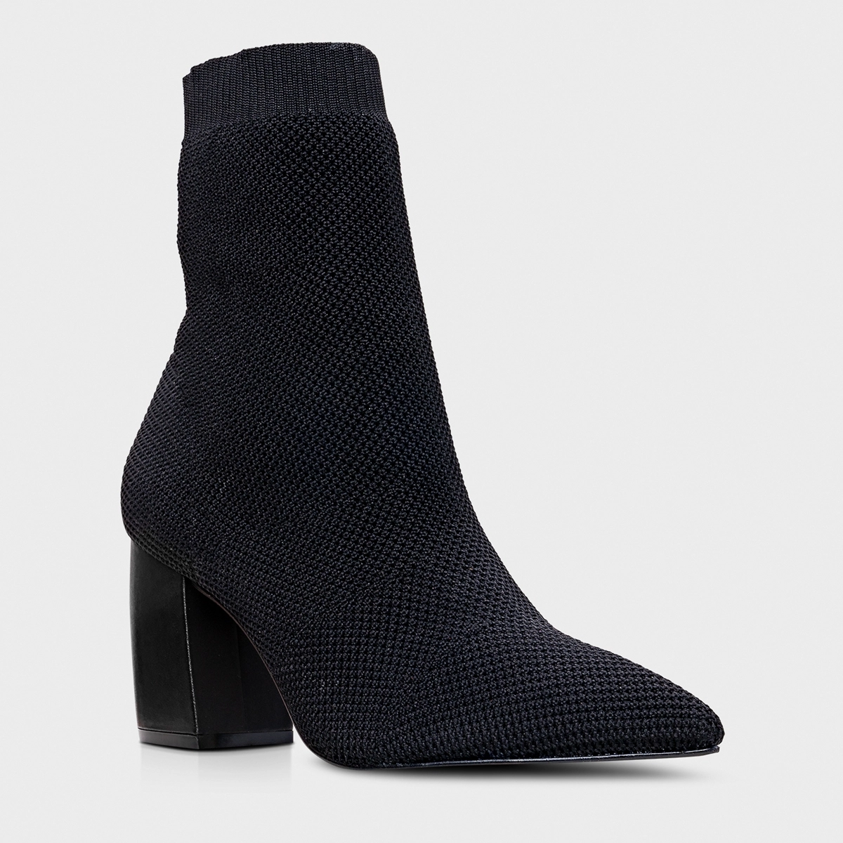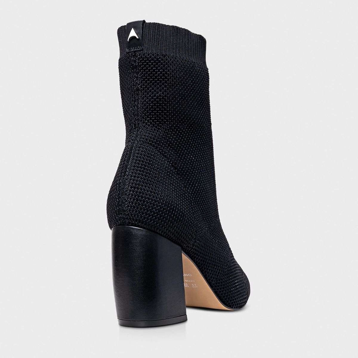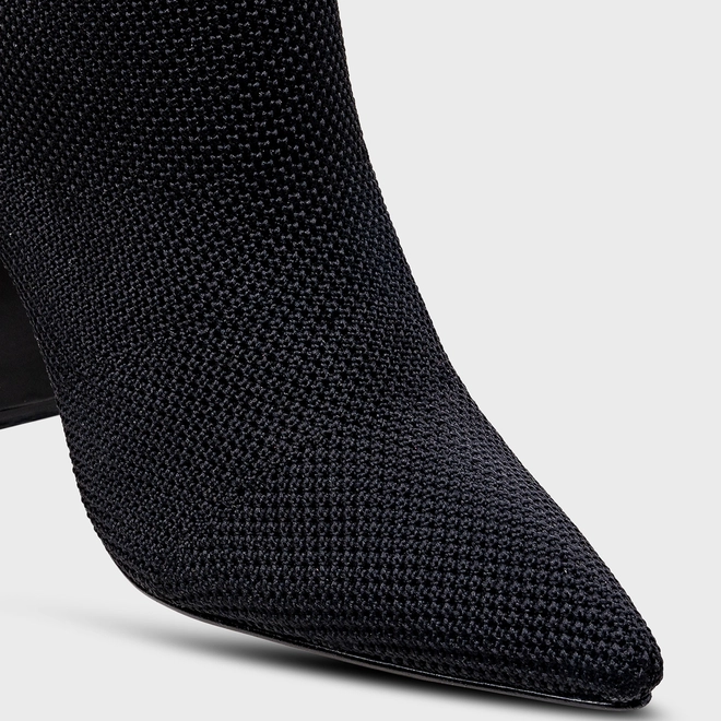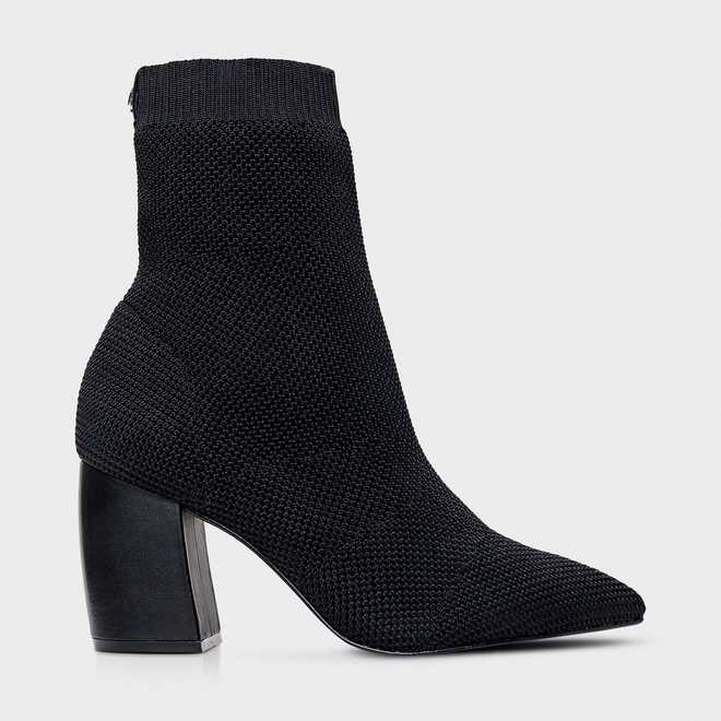 Bota em knit. O modelo tem cano médio, salto bloco e bico fino. Traz cabedal ajustado ao pé, cano estilo meia e tira de gorgurão na parte traseira, auxiliando no calce.