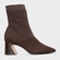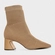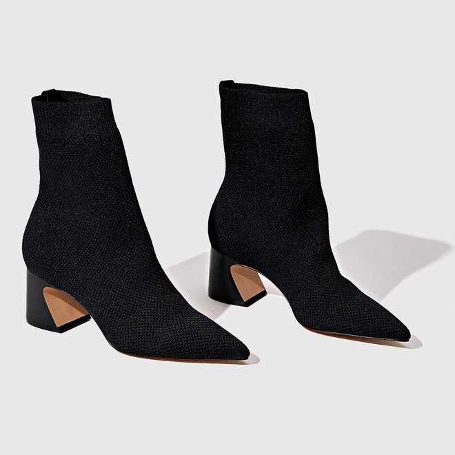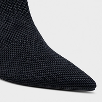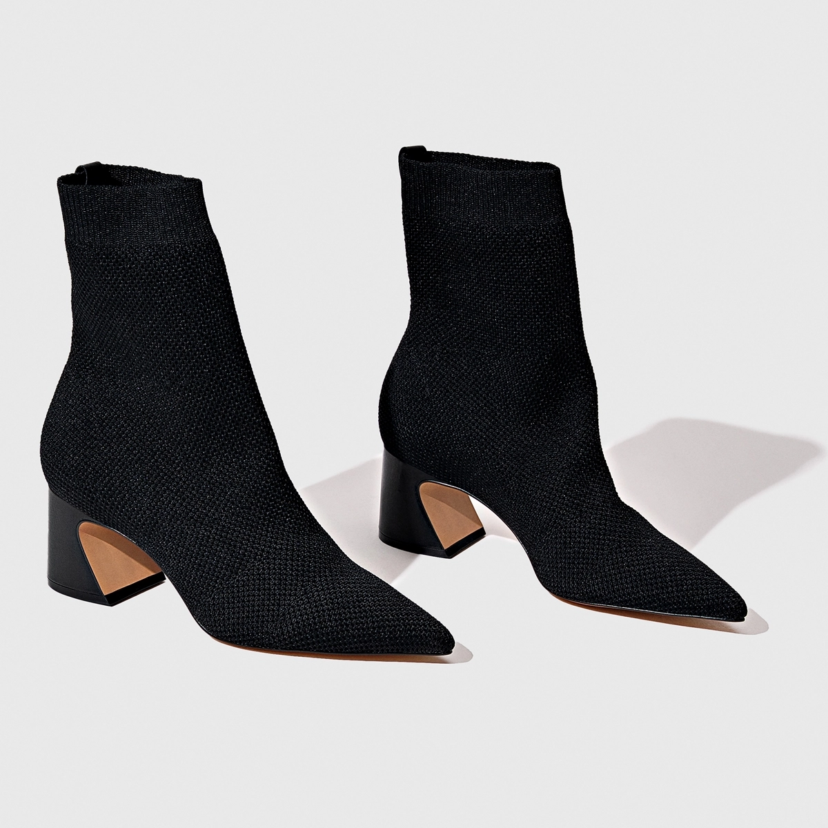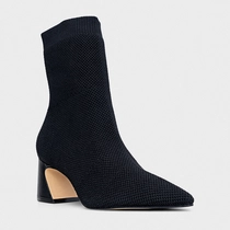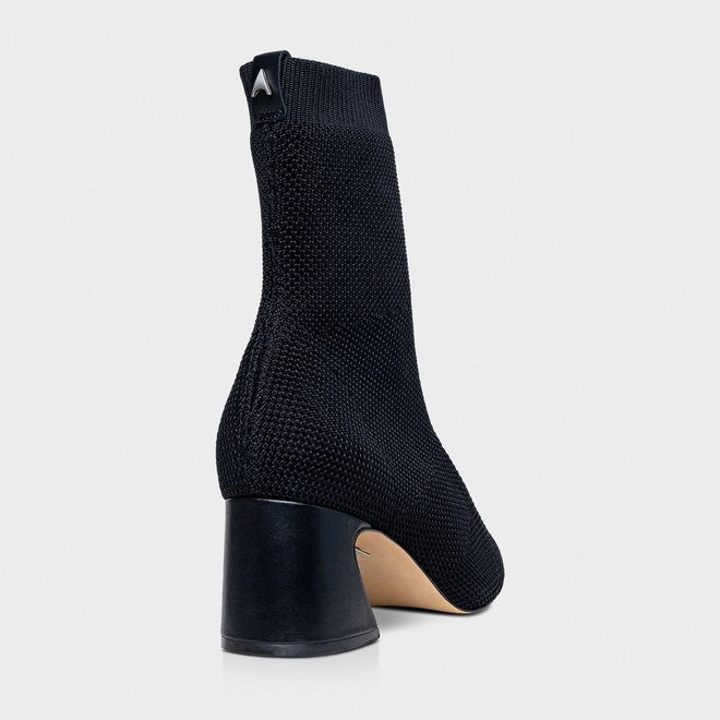 Bota em knit. O modelo tem cano médio, salto geométrico e bico fino alongado. Traz cabedal ajustado ao pé, cano estilo meia e tira de gorgurão na parte traseira, auxiliando no calce.