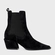 Bota western de cano médio em couro suede. Possui salto bloco e bico alongado com ponteira quadrada. Elástico na lateral para facilitar o calce, além de puxador na parte traseira.
