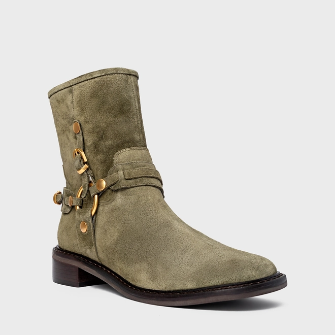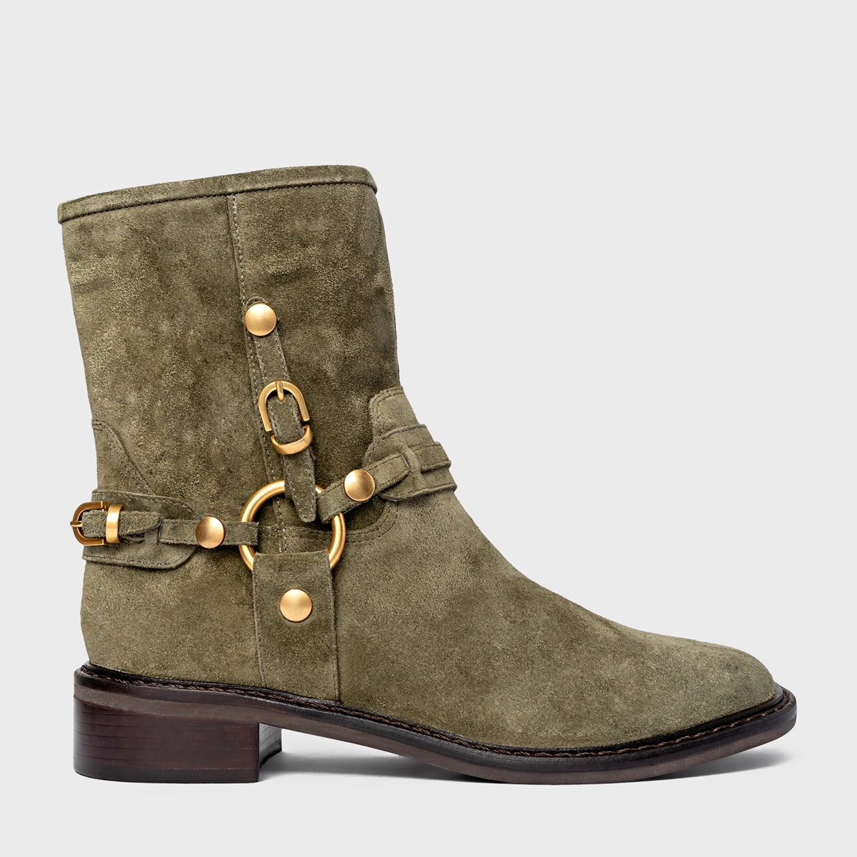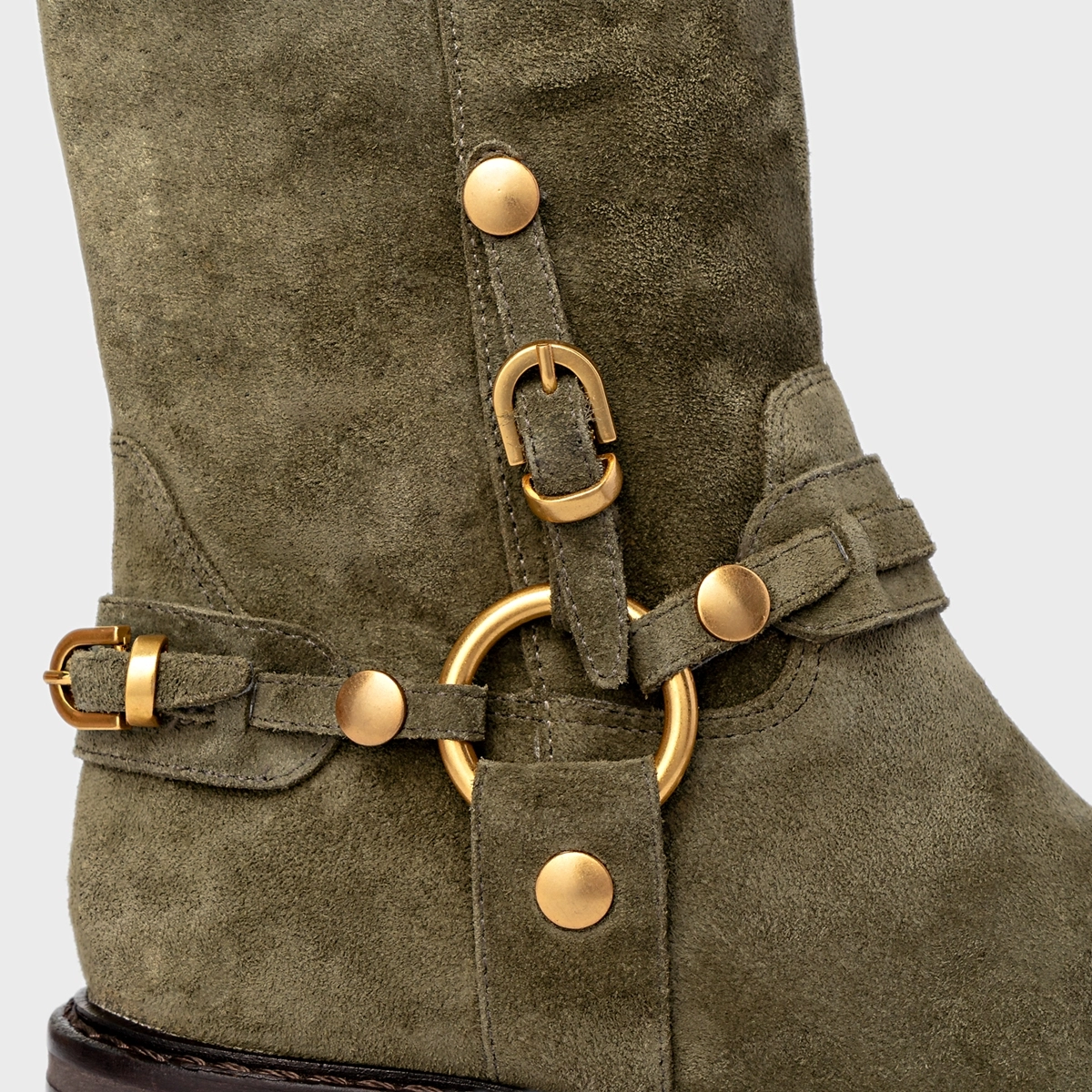 Bota Ring Fivelas Salto Bloco Couro Suede Verde Army Green
