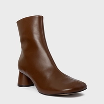 Bota em couro, de cano baixo. Possui bico arredondado, salto oval e fechamento por zíper lateral para facilitar o calce.