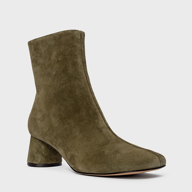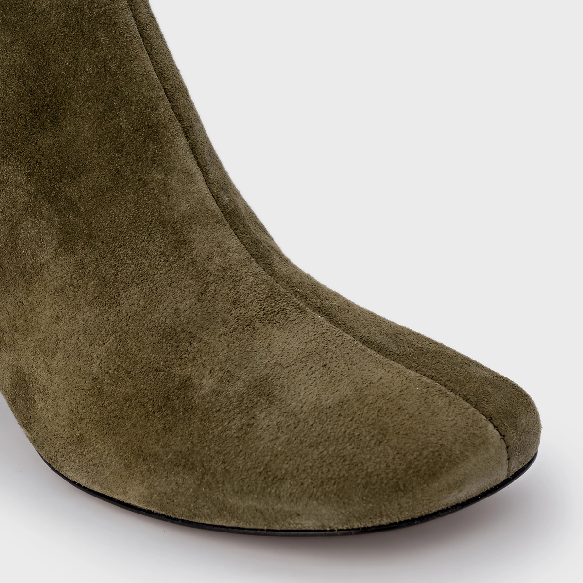 Bota em couro suede, de cano baixo. Possui bico arredondado, salto oval e fechamento por zíper lateral para facilitar o calce.