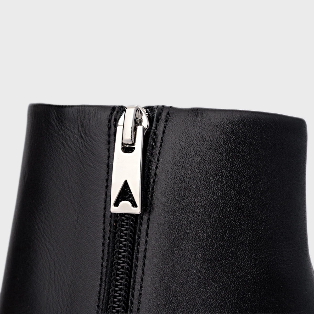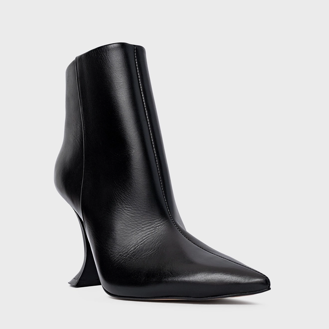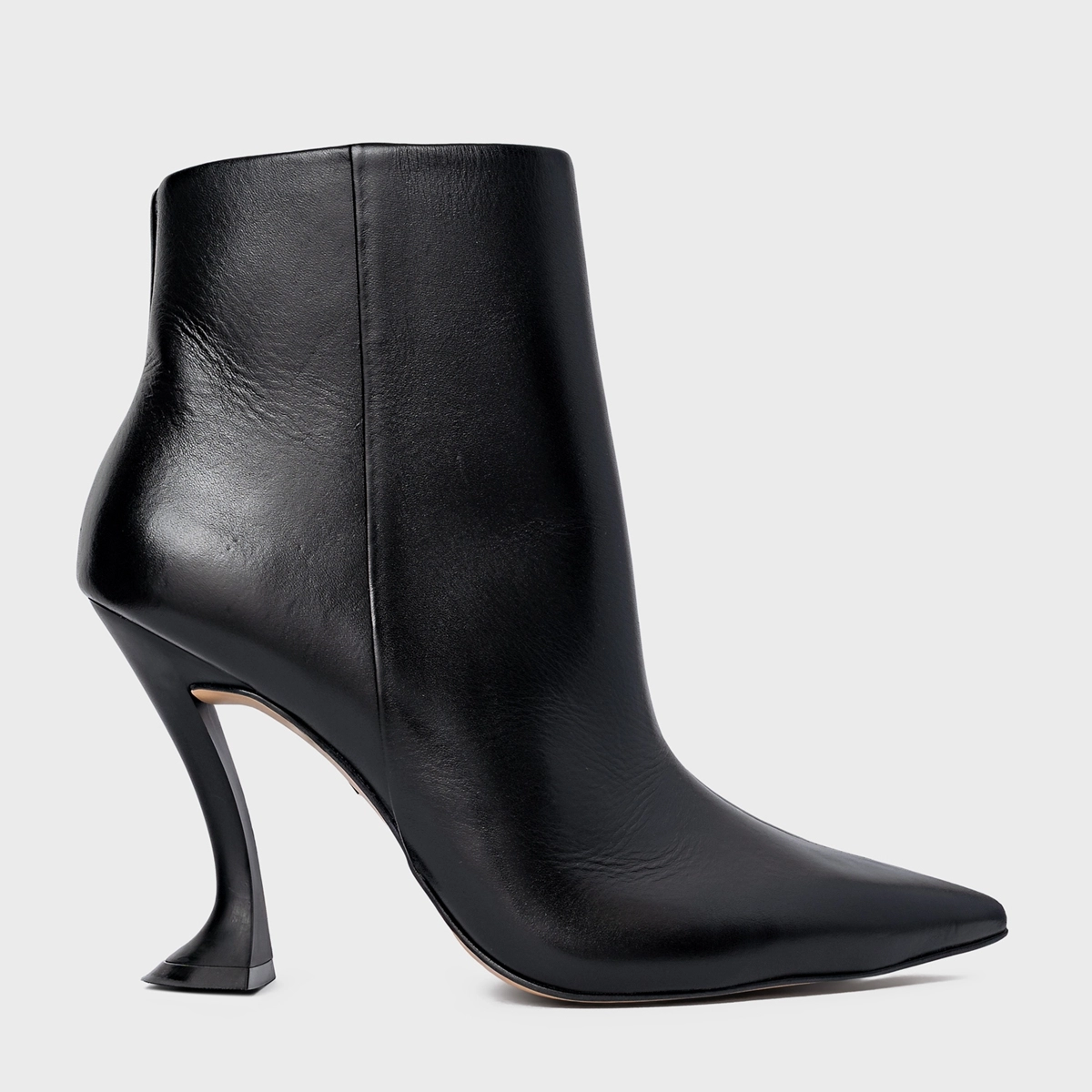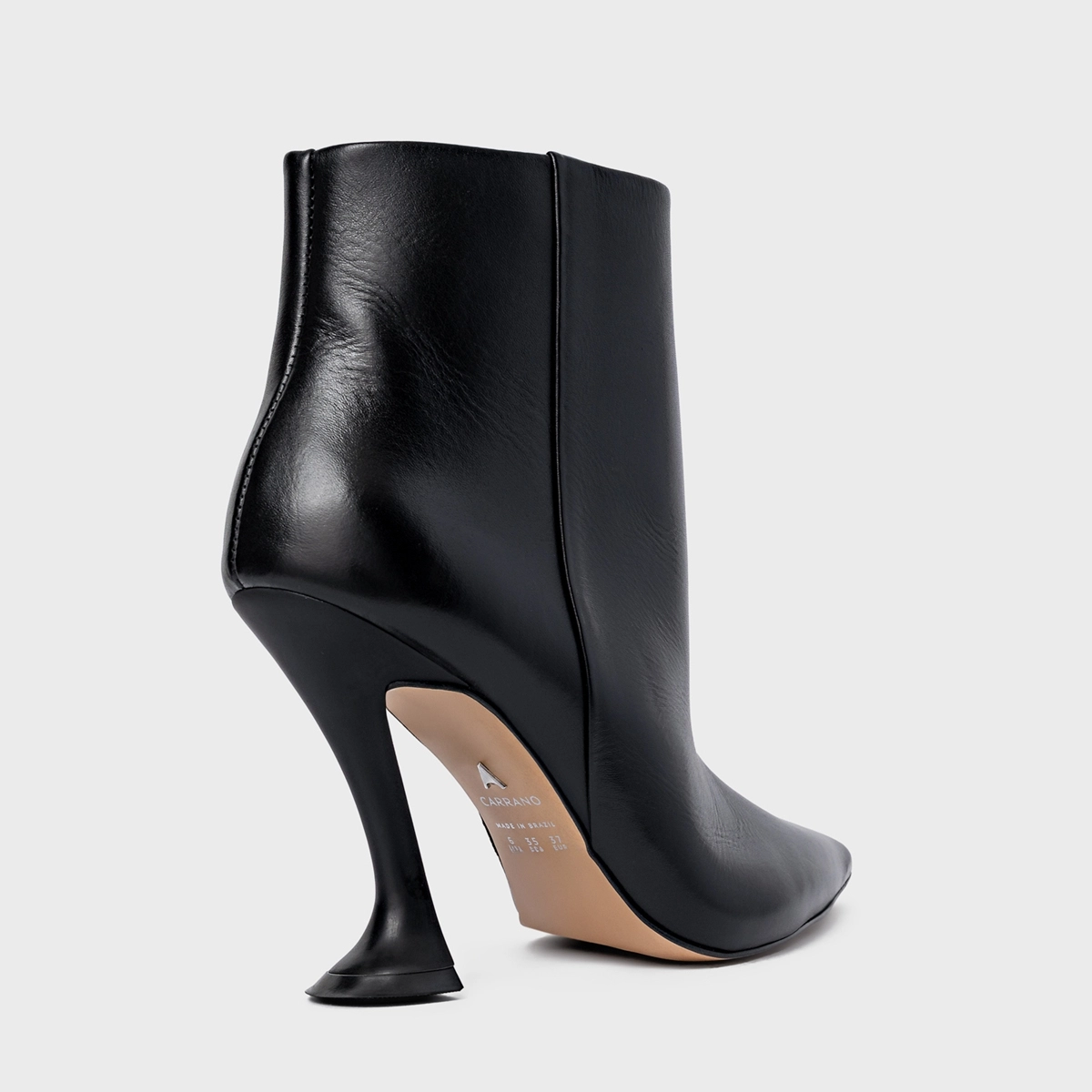 Bota cano médio em couro, com bico fino e salto em formato curvado. O modelo apresenta cabedal liso e fechamento por zíper lateral.