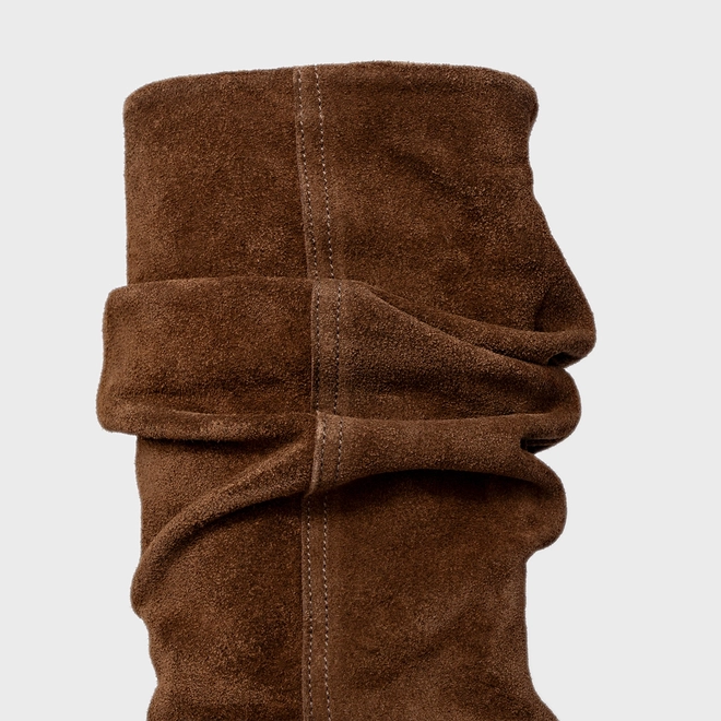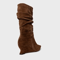 Bota de cano alto slouchy em couro suede. Possui salto anabela, bico fino e zíper lateral para facilitar o calce.
