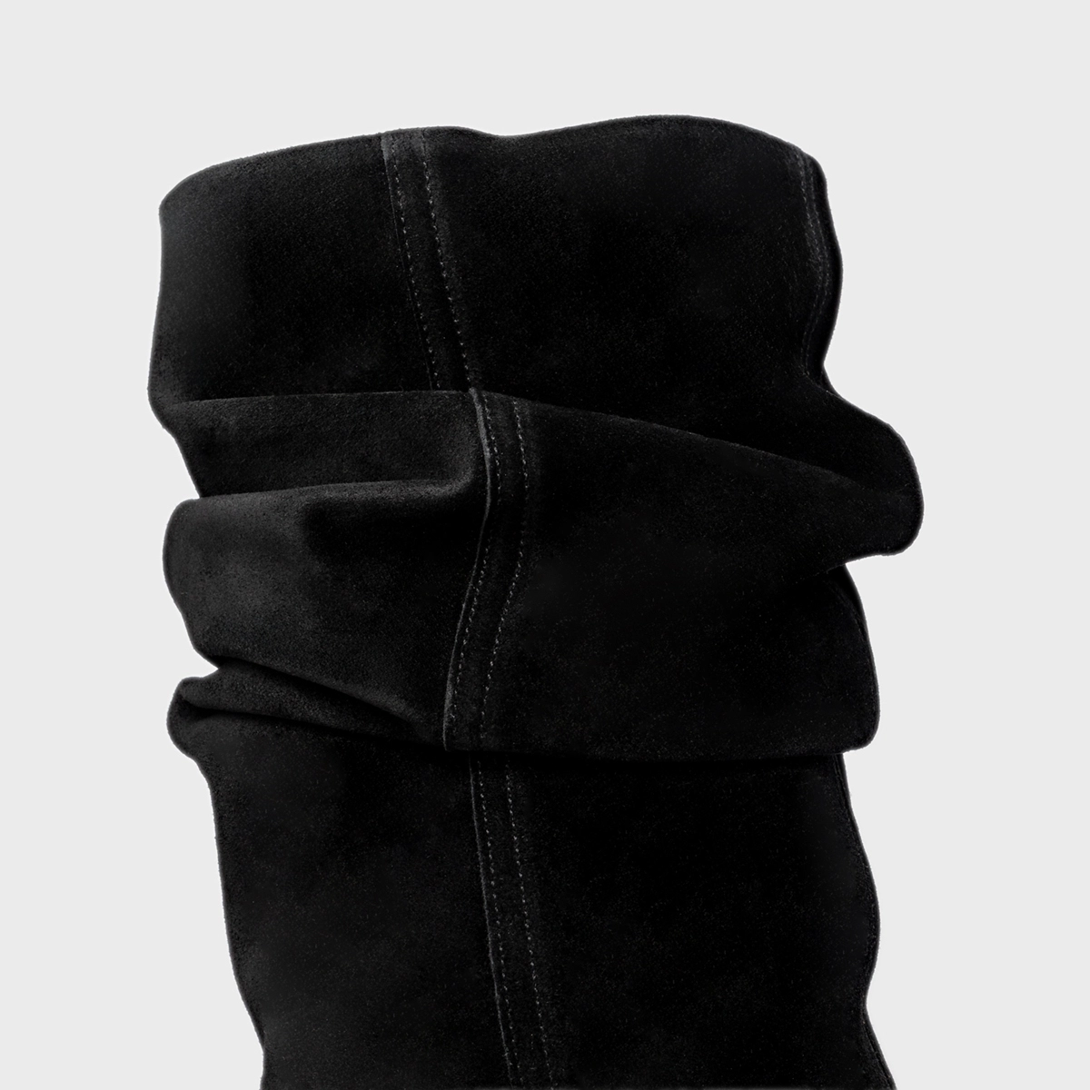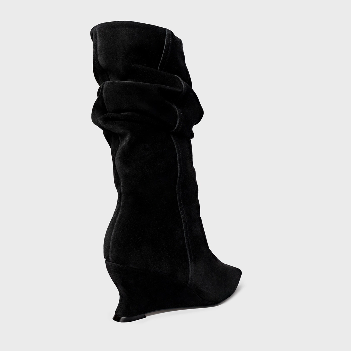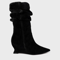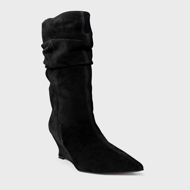 Bota de cano alto slouchy em couro suede. Possui salto anabela, bico fino e zíper lateral para facilitar o calce.