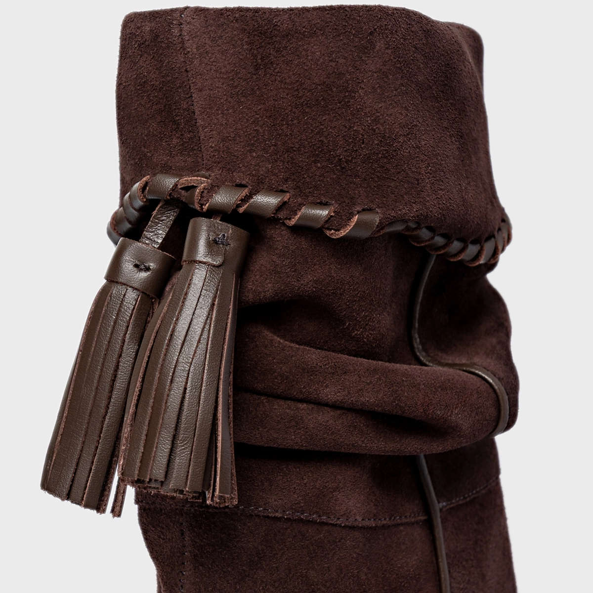 Bota Slouchy Franjas Salto Fino Couro Suede Marrom Ganache